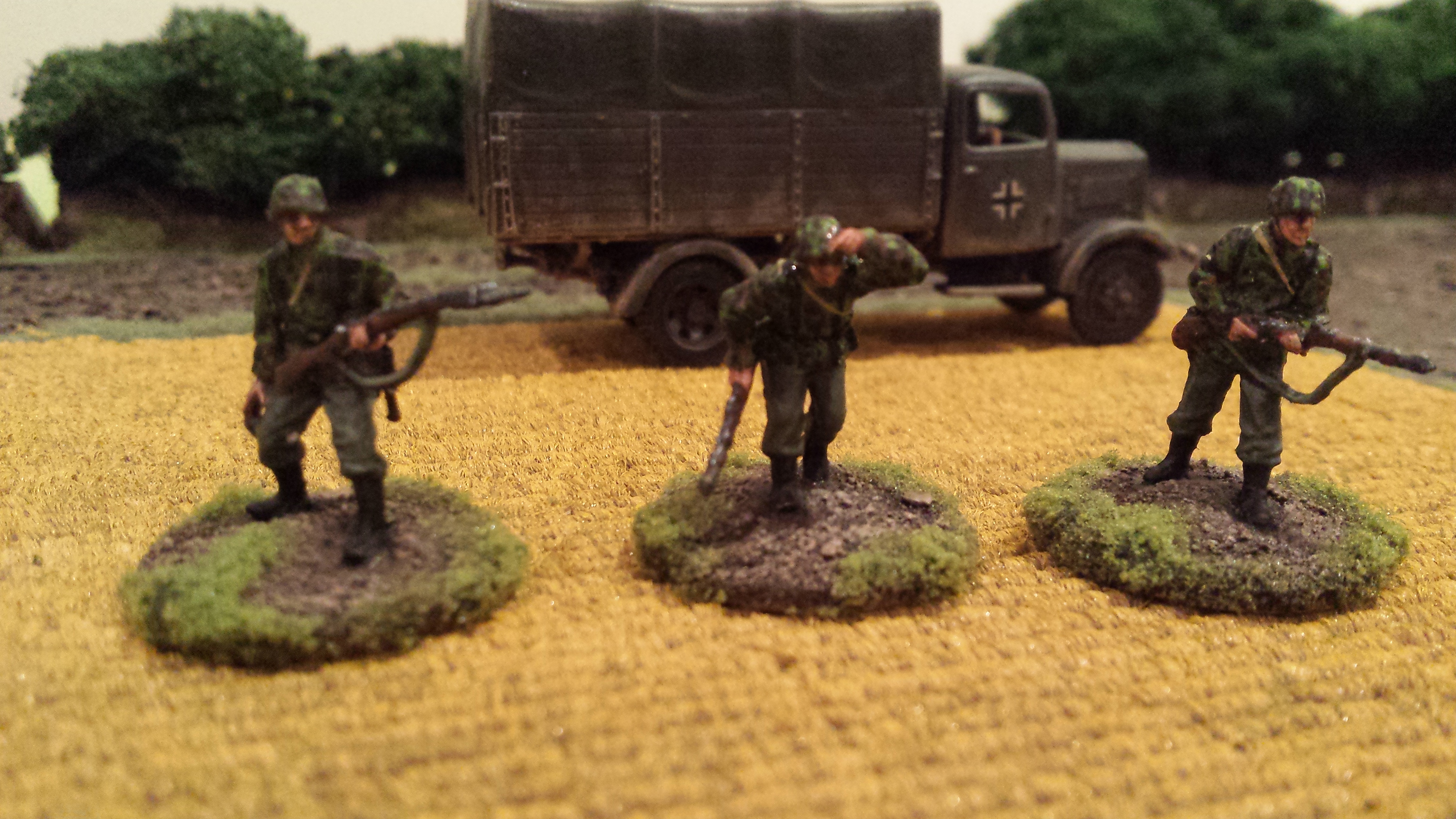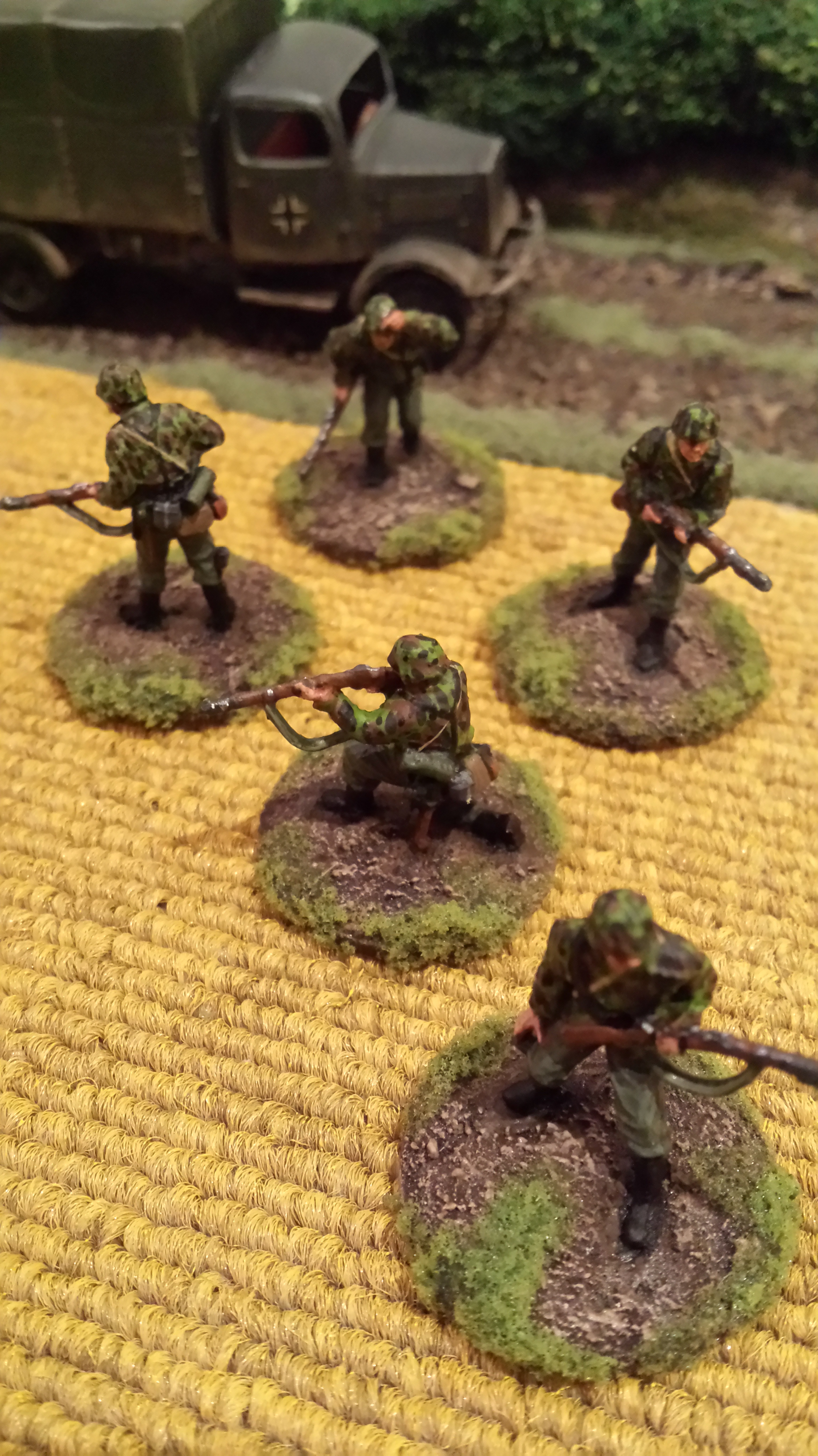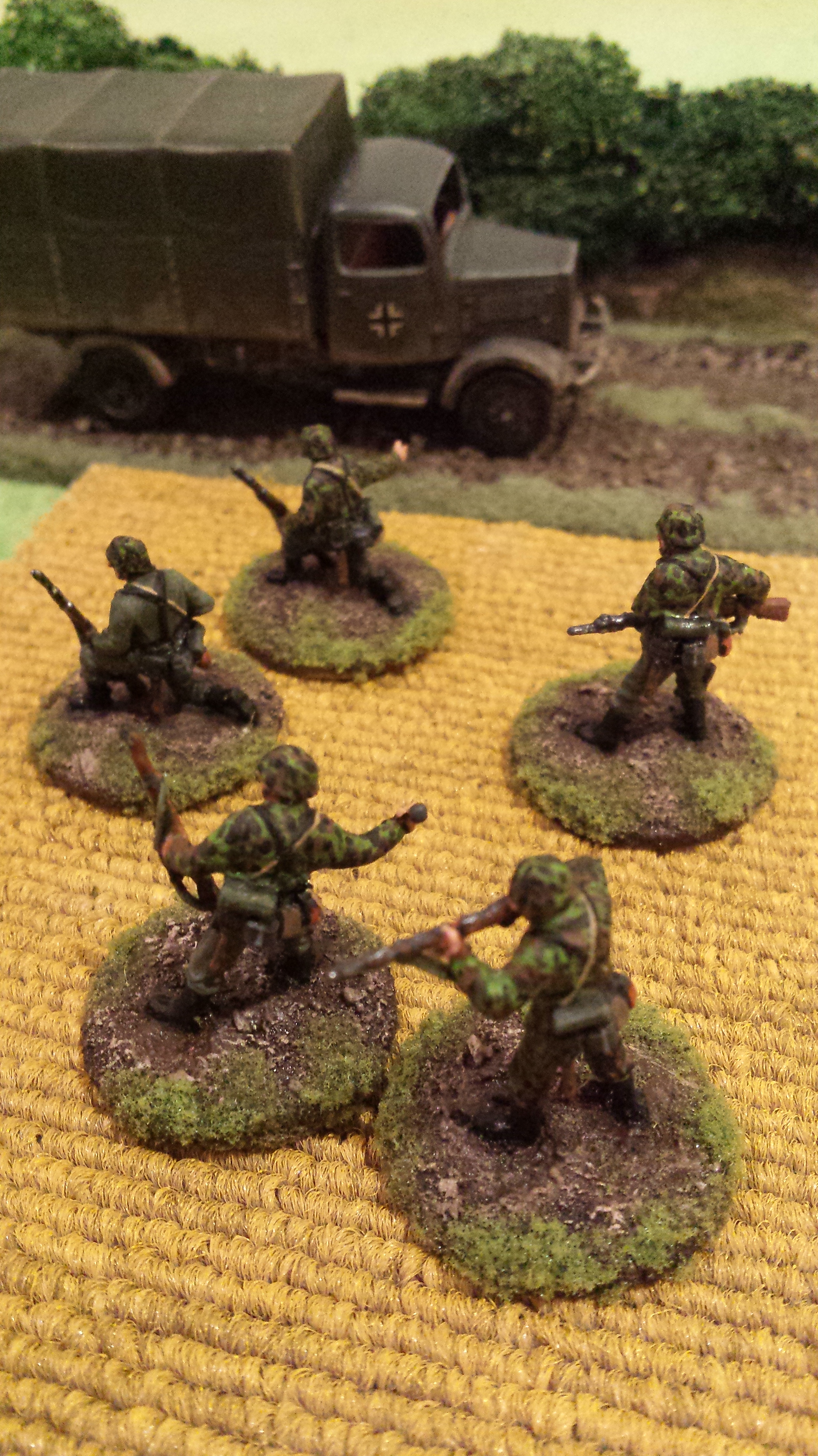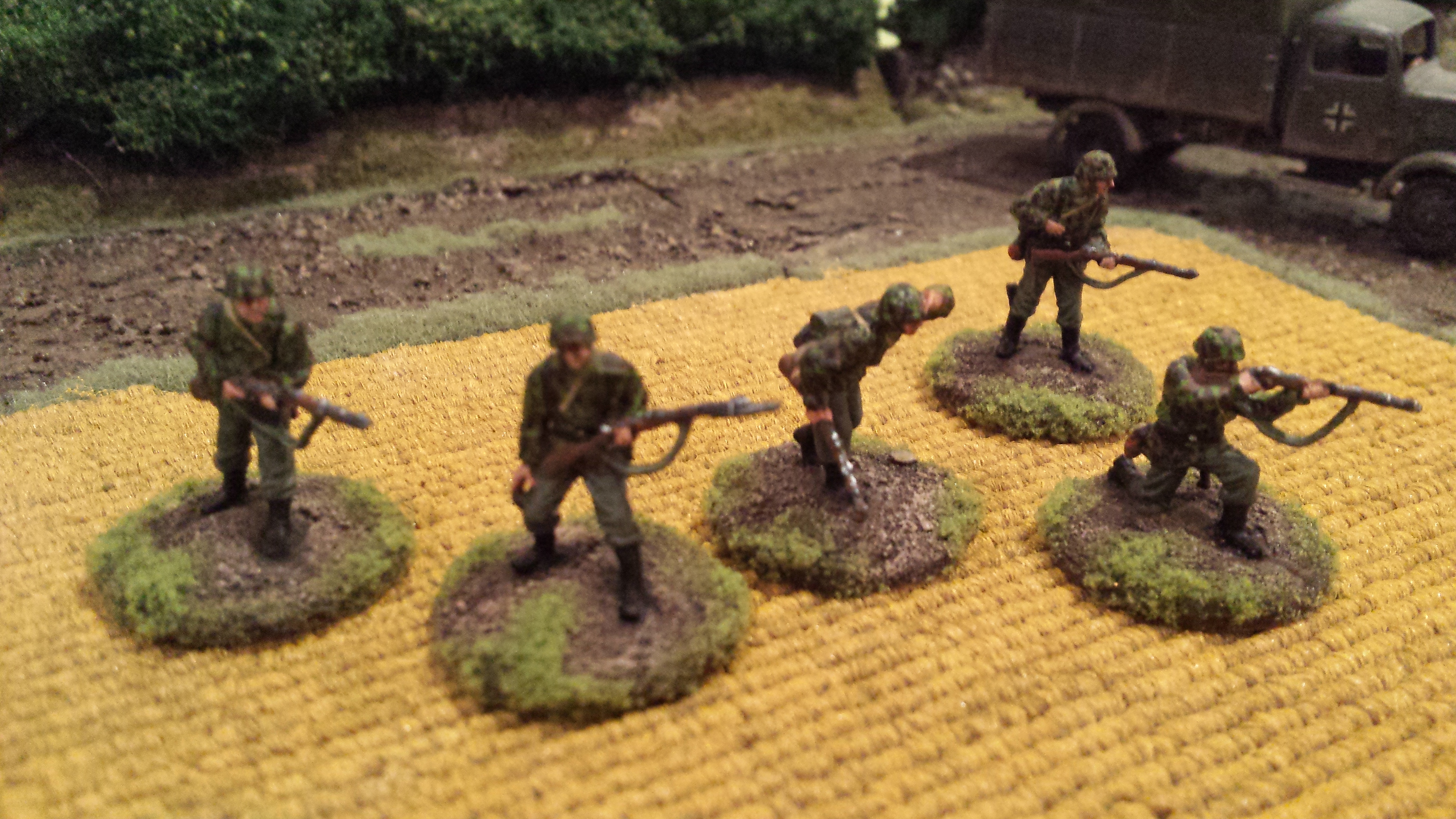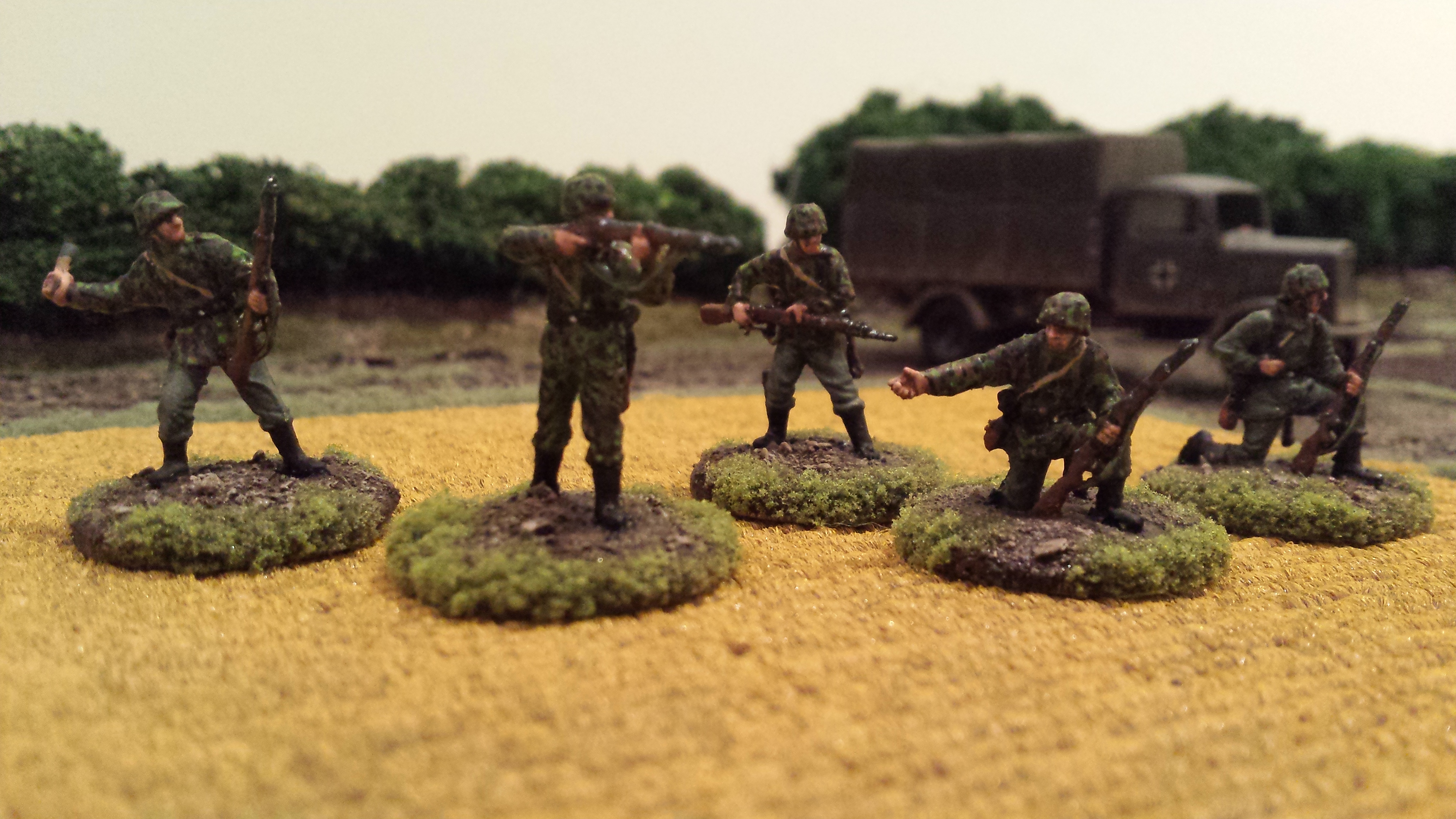 My painting of these guys is my own interpretation of German camouflage schemes, somewhere between peadot and oakleaf… I wasn’t too bothered which, but was happy how they turned out. I use a base of a bright olive green, then do adjacent patches of red brown and dark green. Then go back over with smaller dots of brown and dark green. Finally I put a bunch of tiny bright olive green dots across the whole thing. I do all the camo first so you can just paint the webbing and straps over the top. Pants were field grey from Tamiya paints. Painting German camo is a labour intensive job but I was happy the way things turned out with these lads. Some pictures below! Its hard taking photos of men compared to vehicles, I think I need a better camera. Or a better phone…….