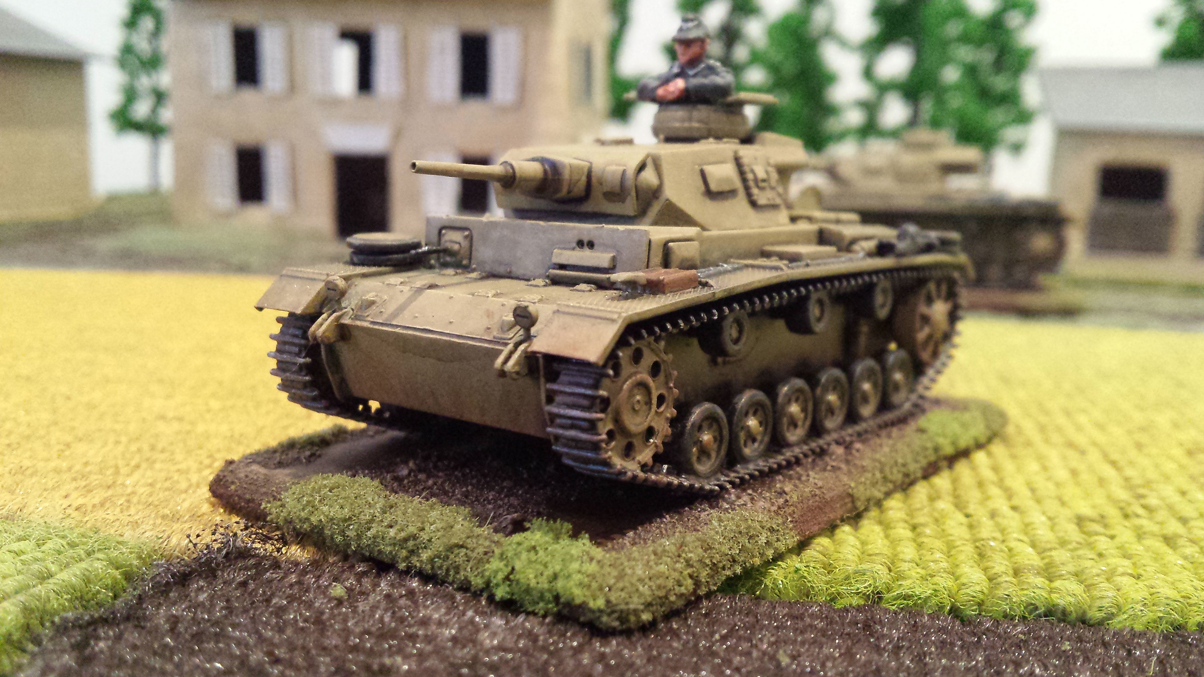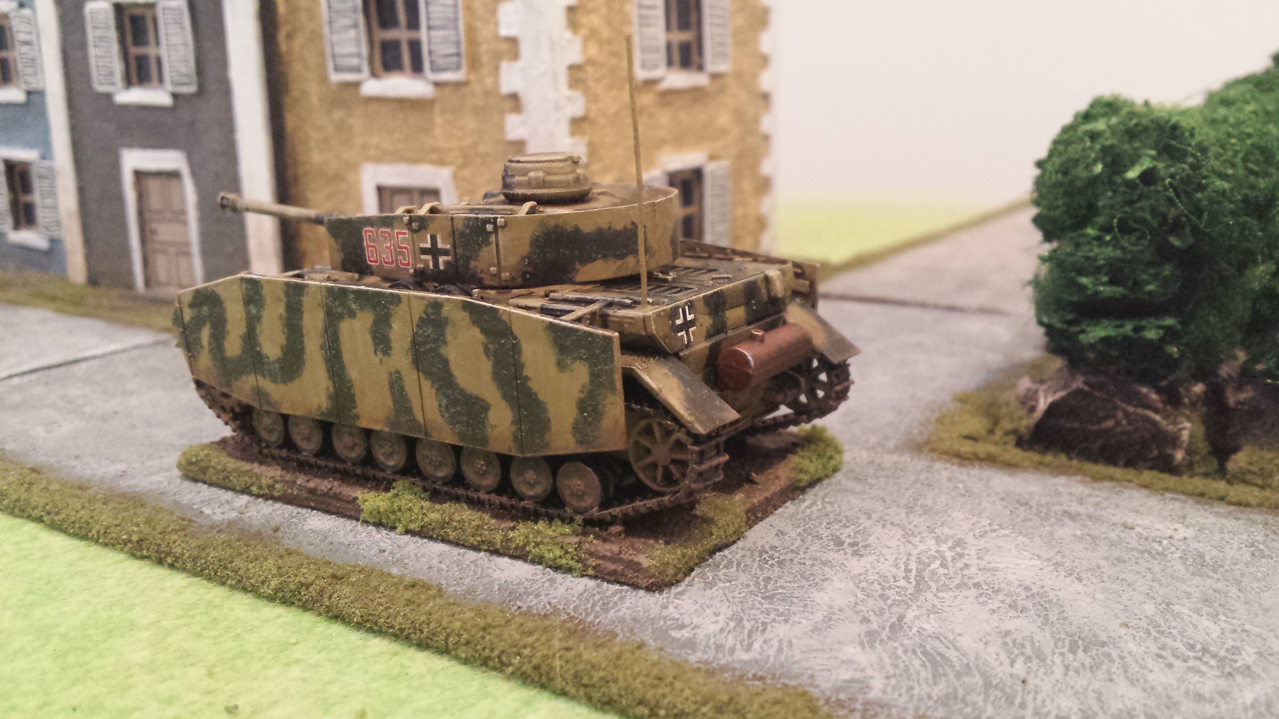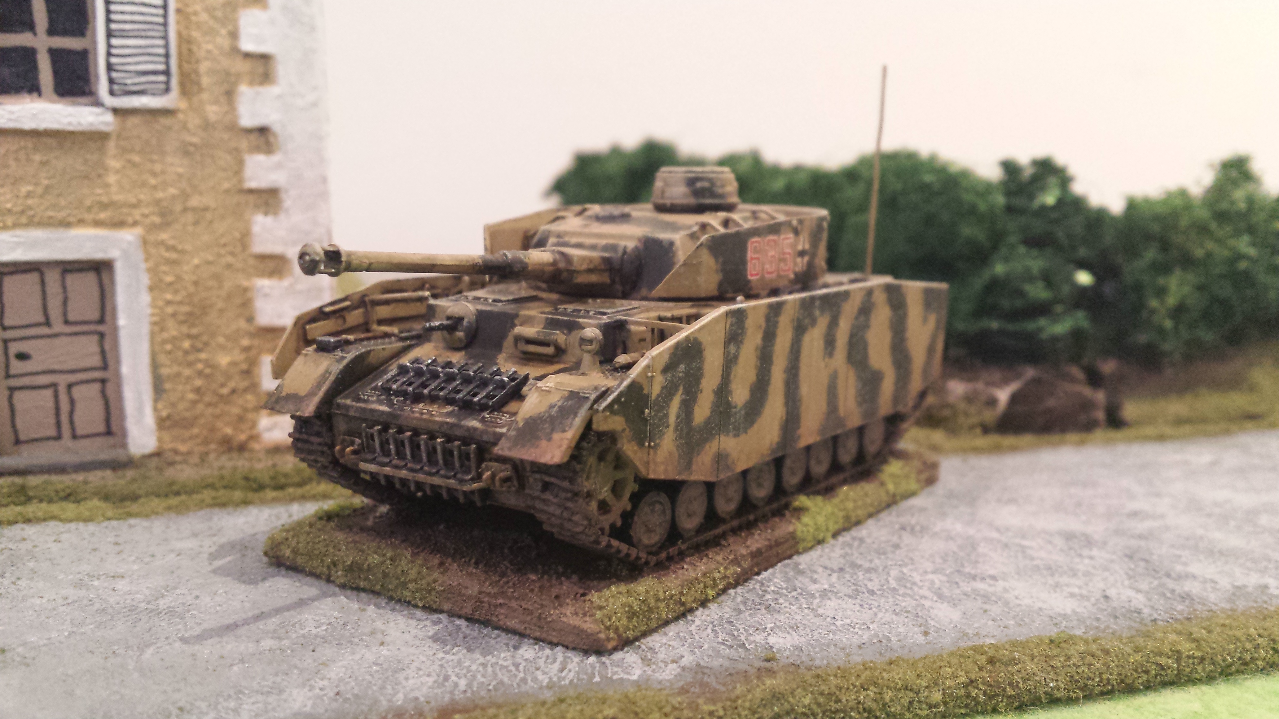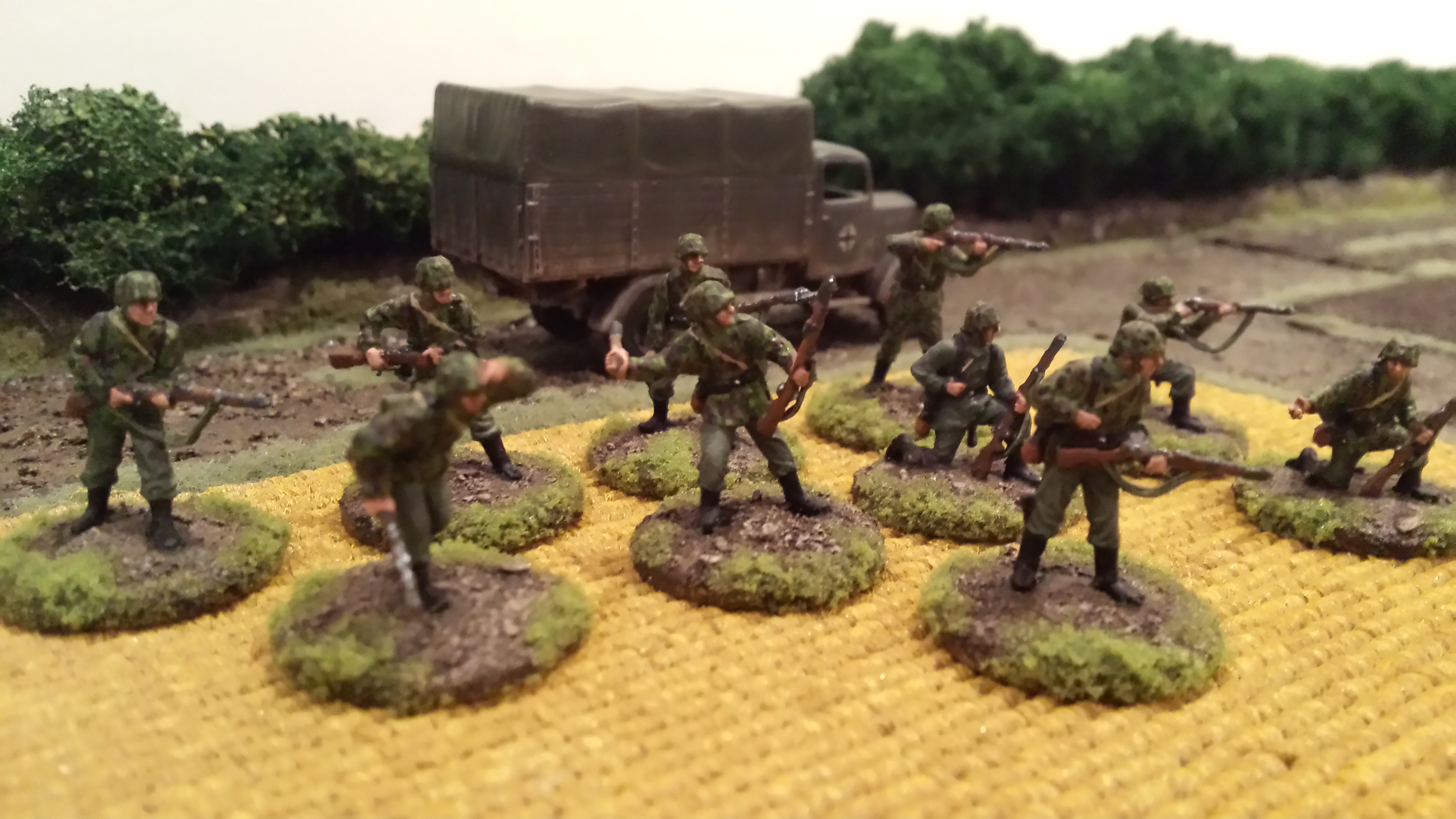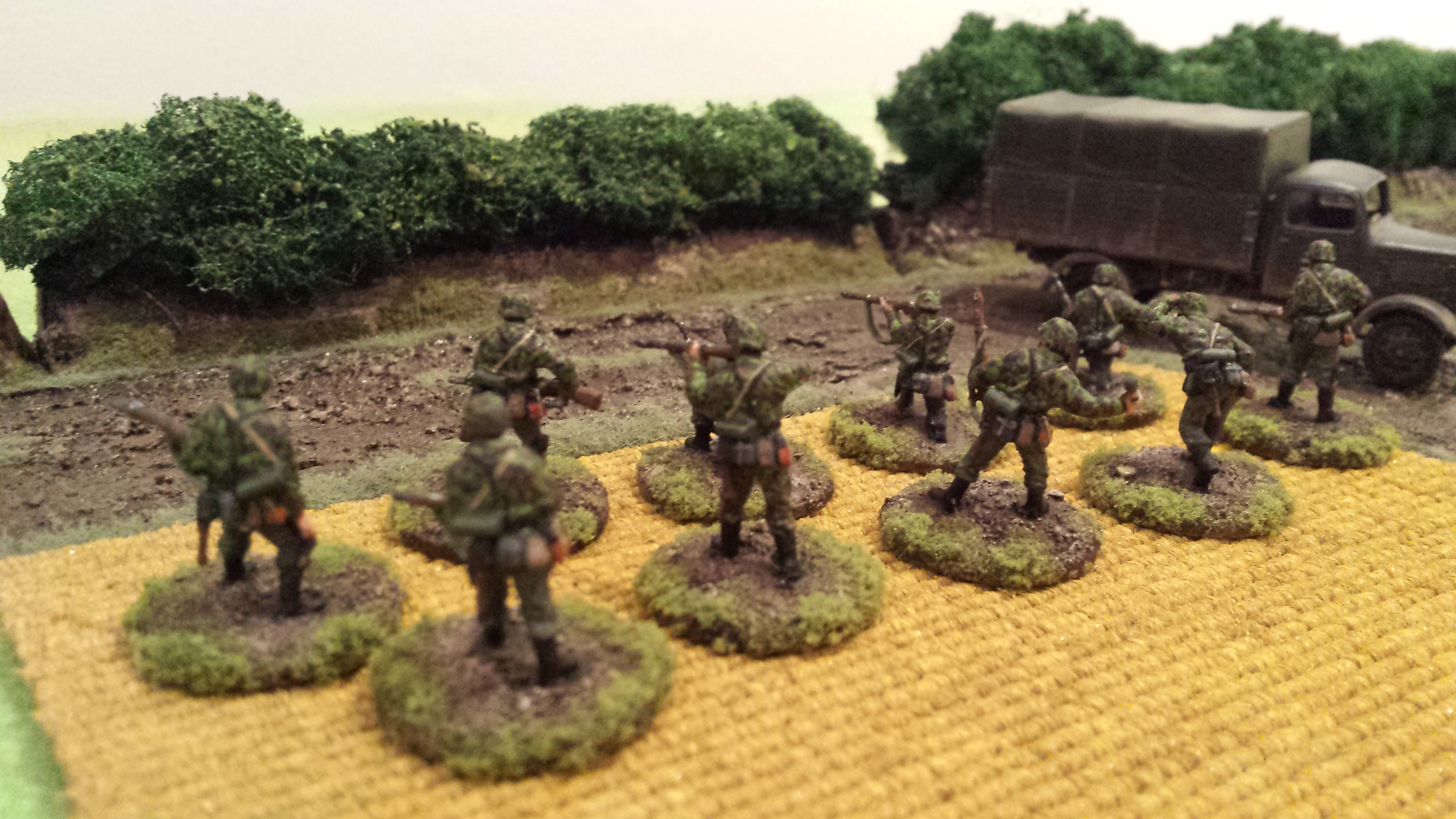 My painting of these guys is my own interpretation of German camouflage schemes, somewhere between peadot and oakleaf… I wasn’t too bothered which, but was happy how they turned out. I use a base of a bright olive green, then do adjacent patches of red brown and dark green. Then go back over with smaller dots of brown and dark green. Finally I put a bunch of tiny bright olive green dots across the whole thing. I do all the camo first so you can just paint the webbing and straps over the top. Pants were field grey from Tamiya paints. Painting German camo is a labour intensive job but I was happy the way things turned out with these lads. Some pictures below! Its hard taking photos of men compared to vehicles, I think I need a better camera. Or a better phone…….