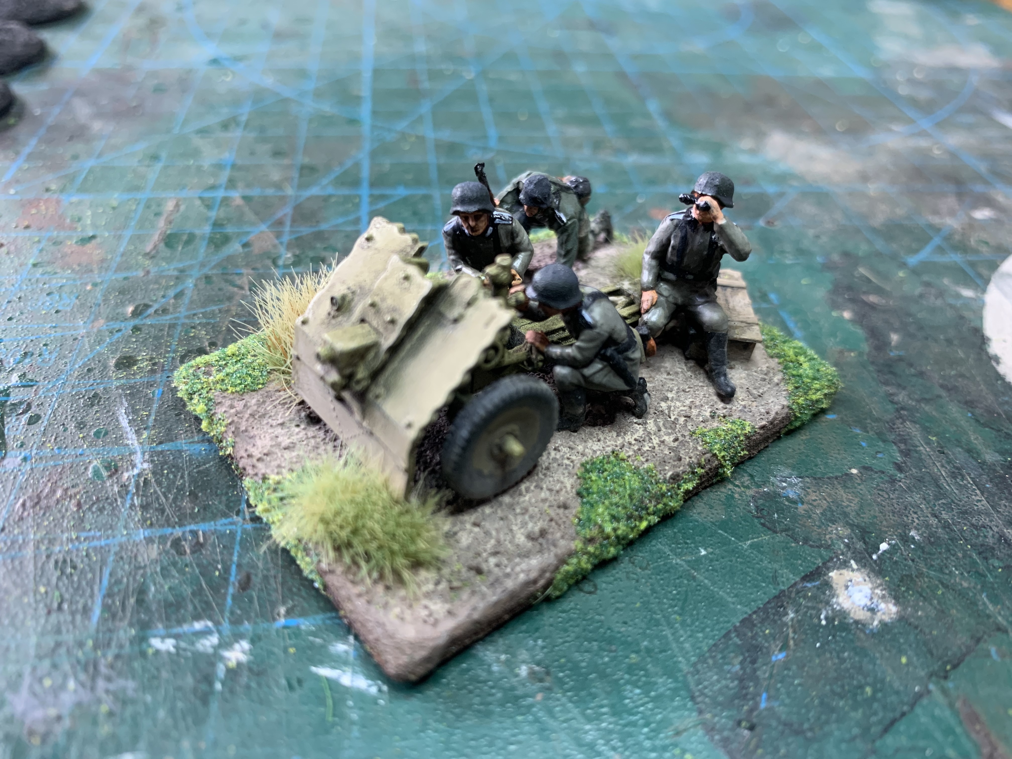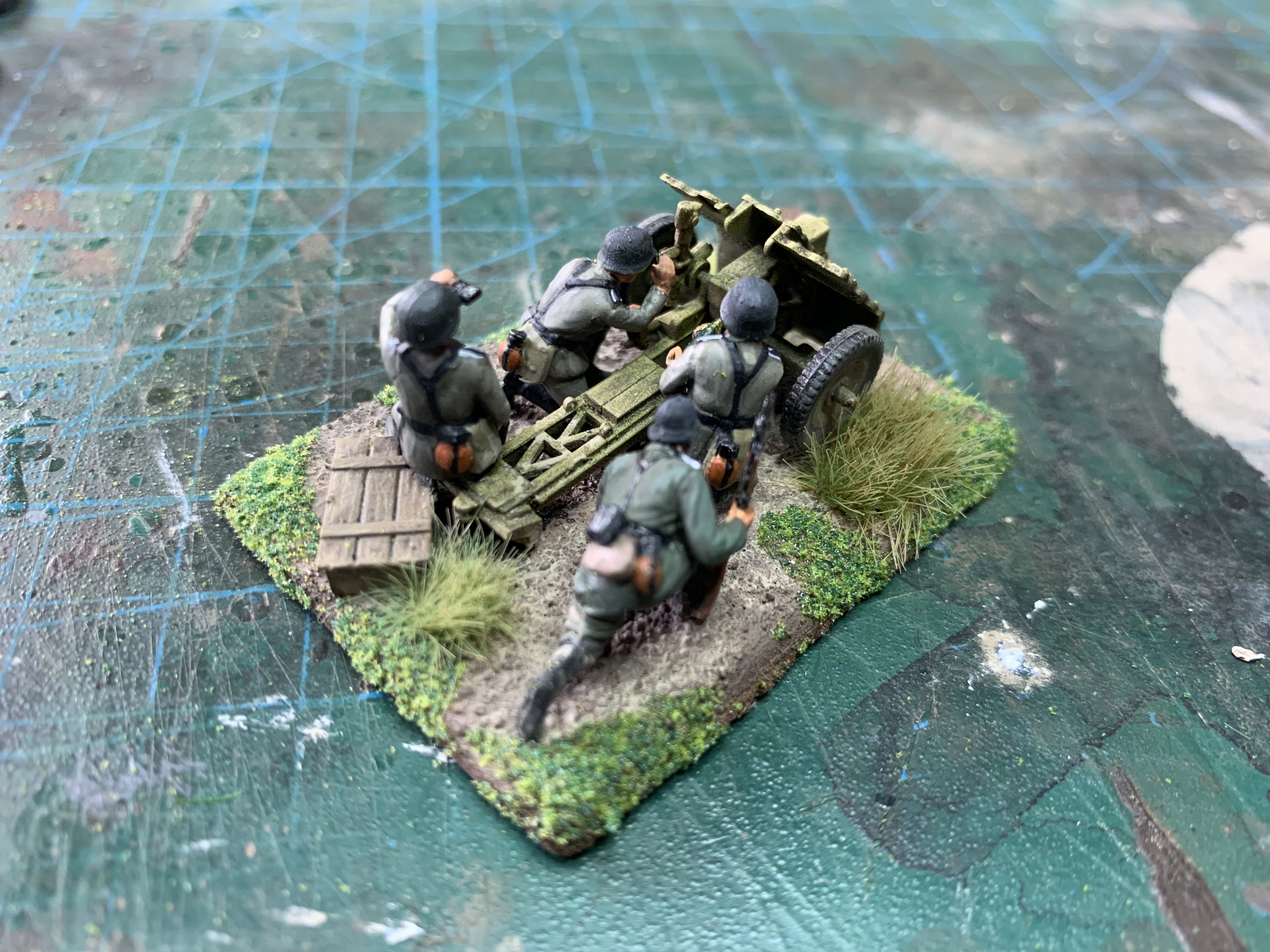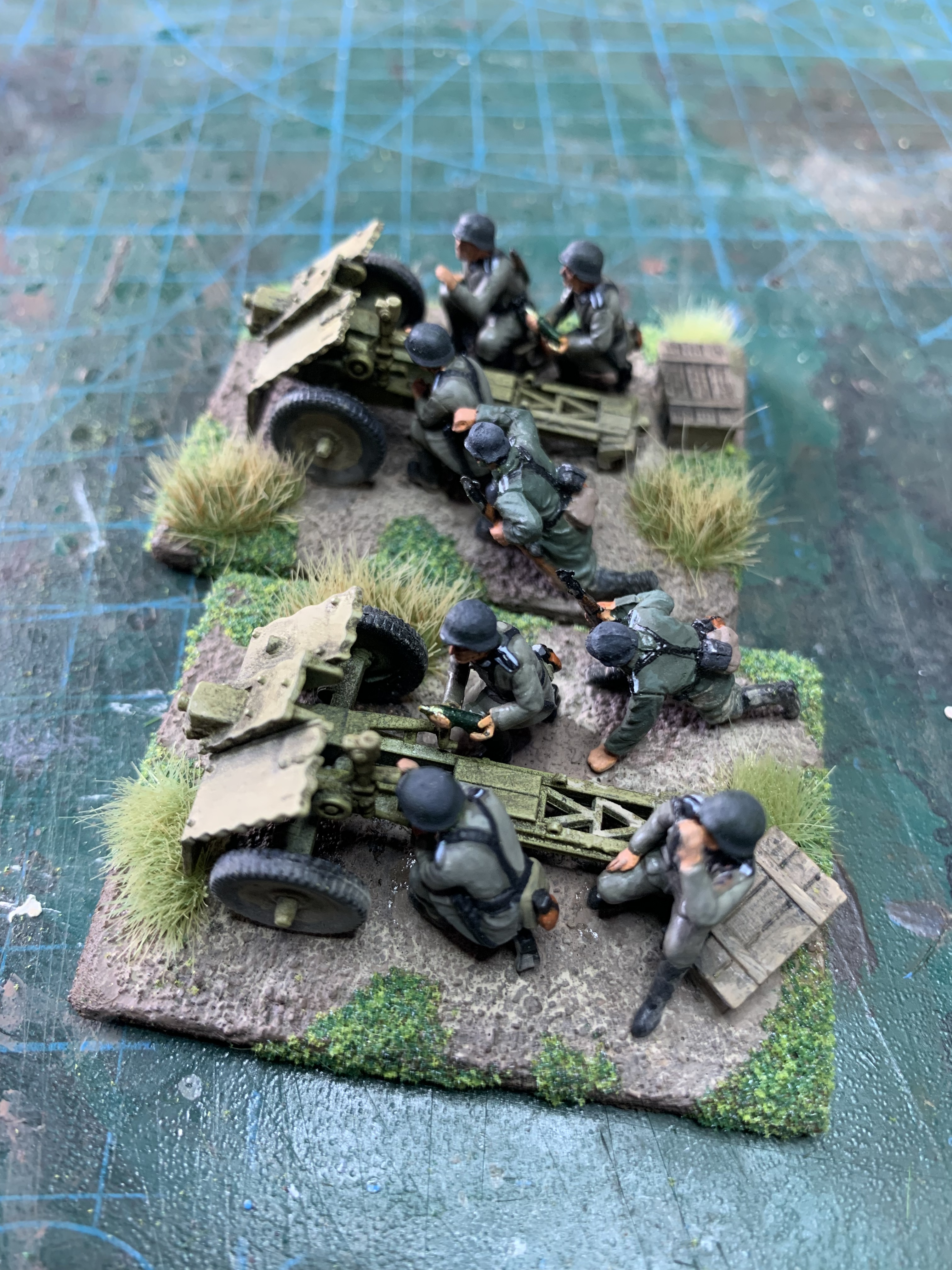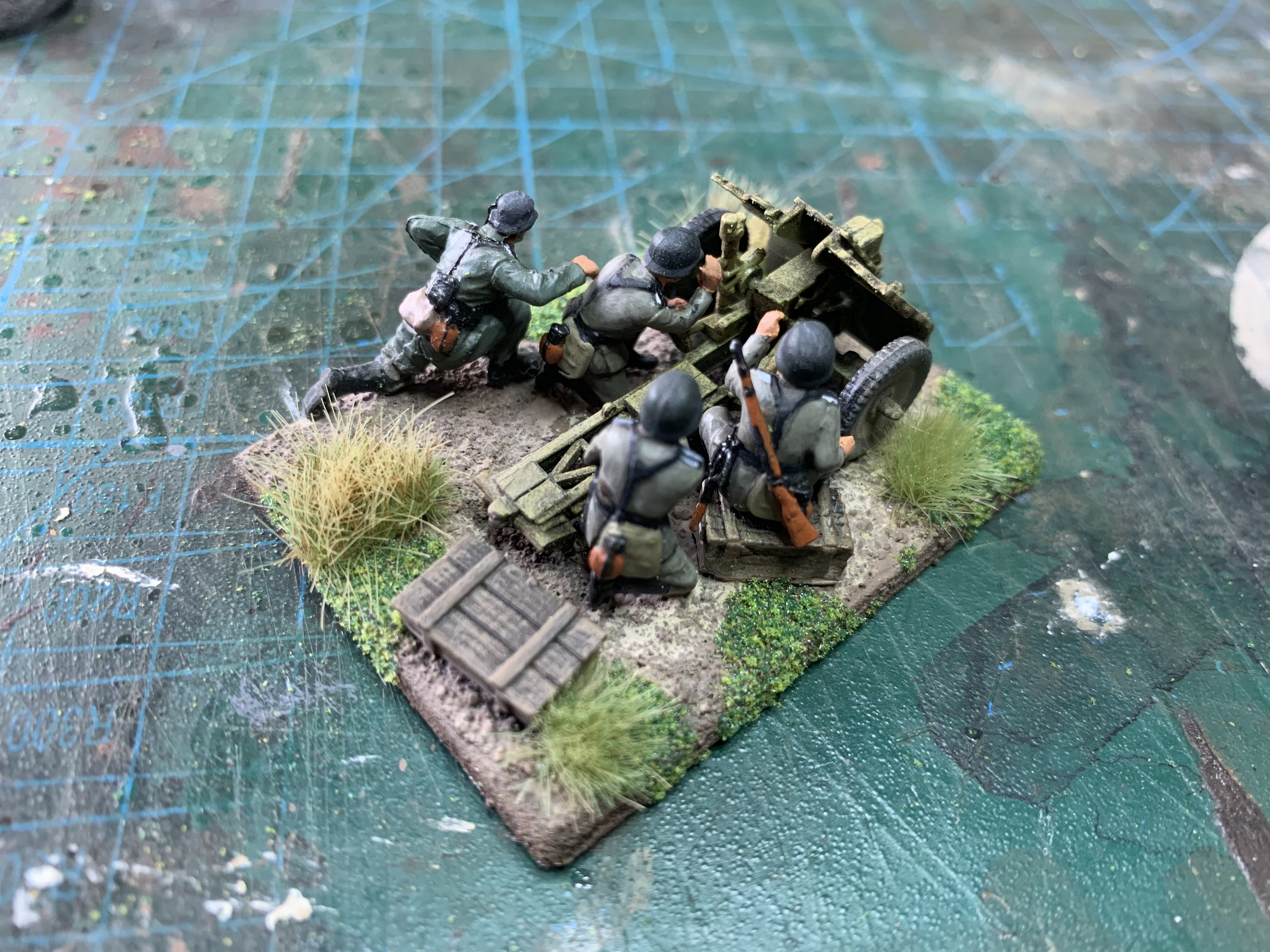 Zvezda make a heap of small scale kits including groups of troops and lots of armour and guns. They are super good value and perfect kits for wargamers. I built two of their German 75mm infantry guns in a matter of minutes as they come in minimal parts but do not sacrifice too much detail. It’s a soft grey plastic that glues nicely. There is a base supplied but I abandon those as prefer to do my own thing. Each gun comes with two crew figures, a loader and a gunner. I am sure the minimum crew for one of these would be more like four, so I pinched a couple of other crew men and just some kneeling troopers to bulk up my crew. The build was really easy and painting was just a coat of dark yellow and a brown wash. The crew took me a lot longer in various shades of field grey. I also added a box or two to the base for some added interest. I have a Zvezda Pak-40 sitting on the bench which will have some excellent AB crew painted up next.