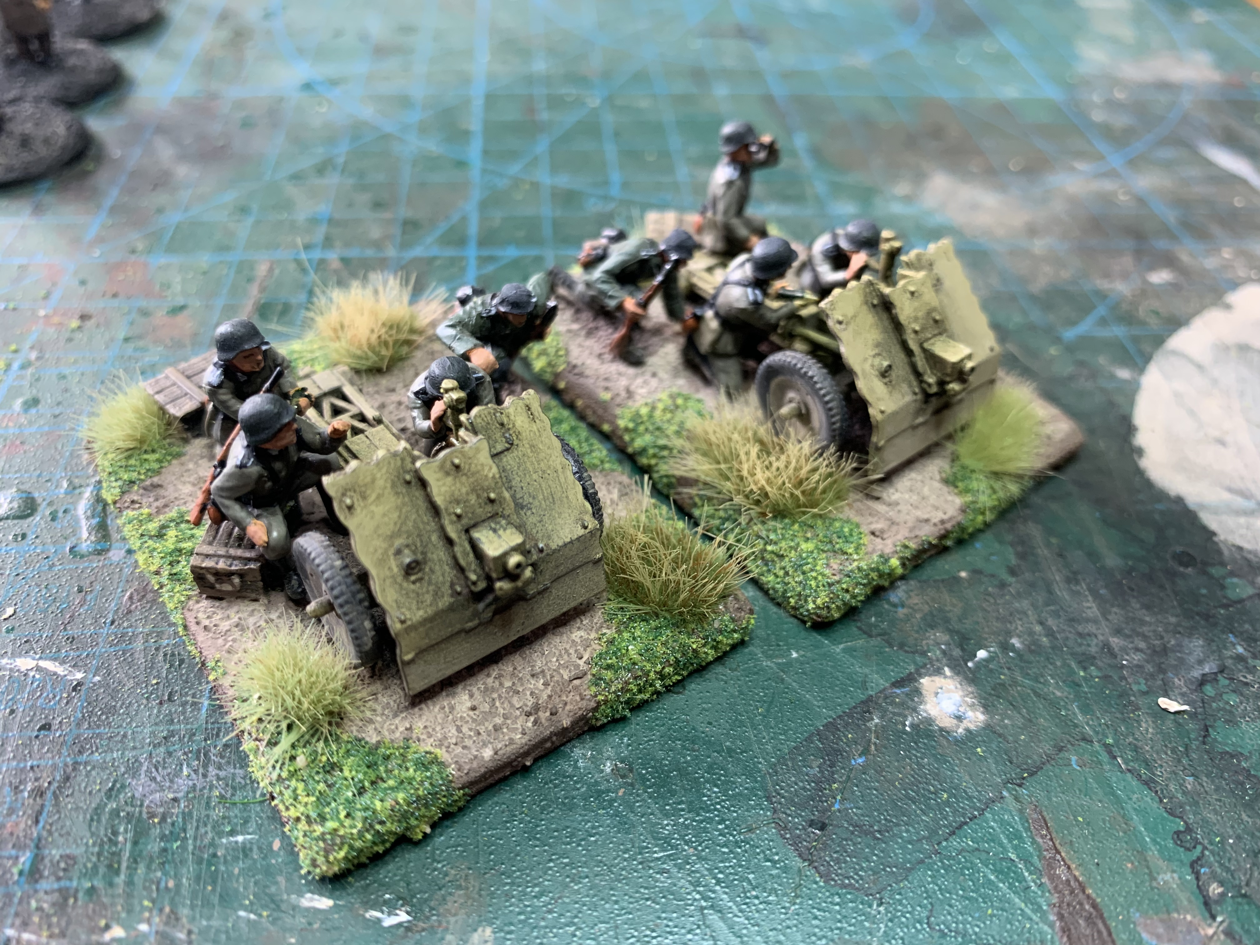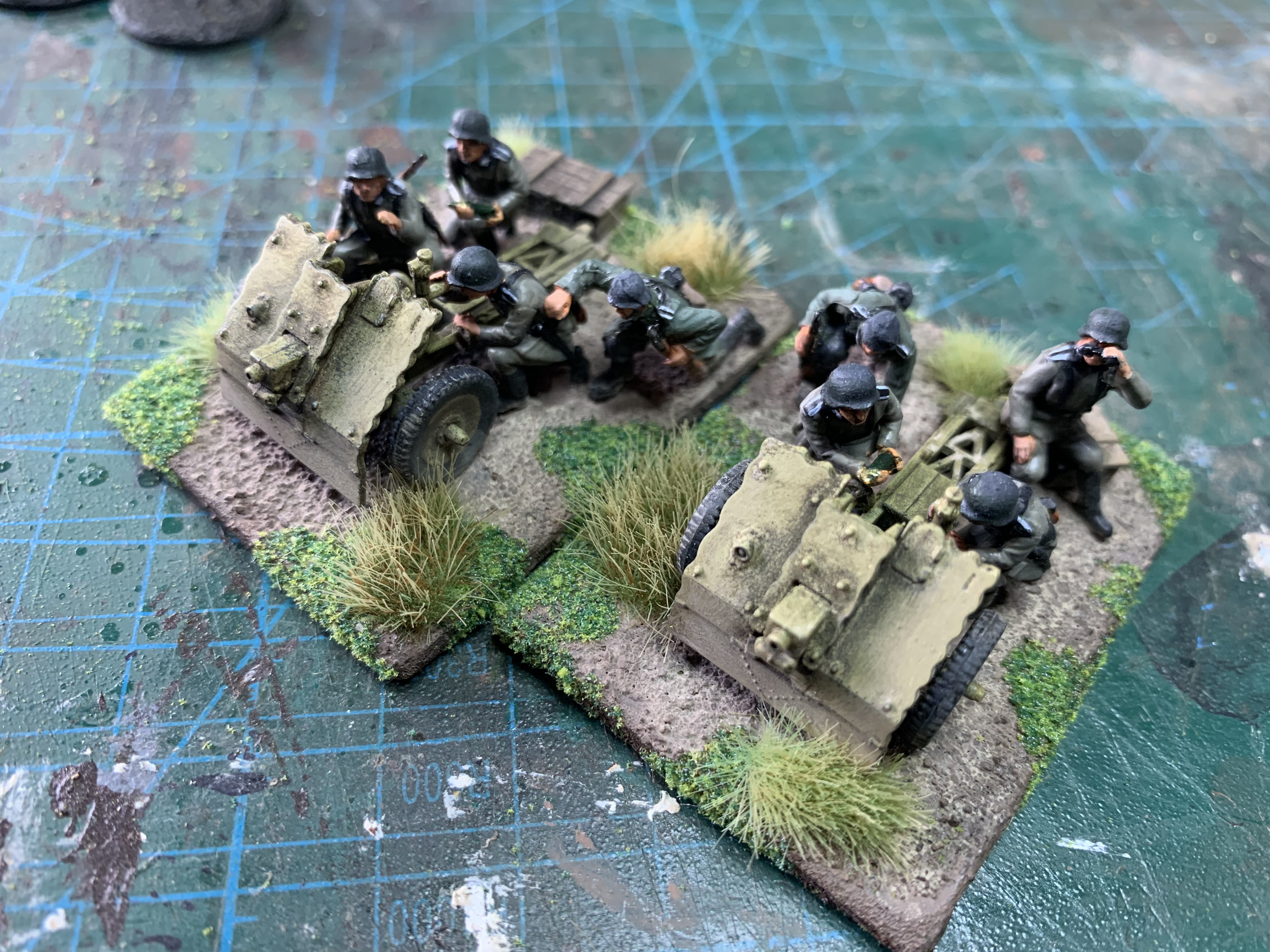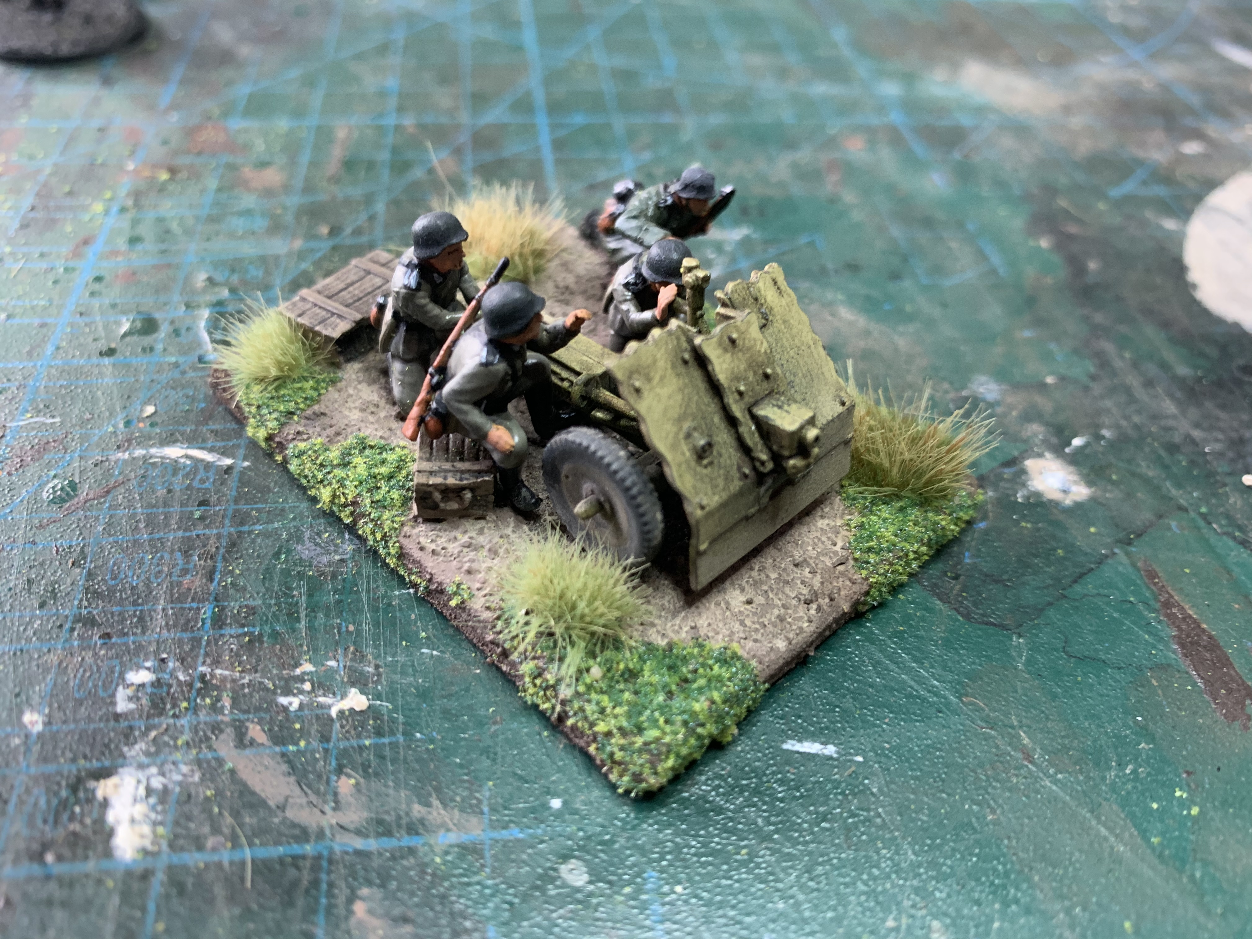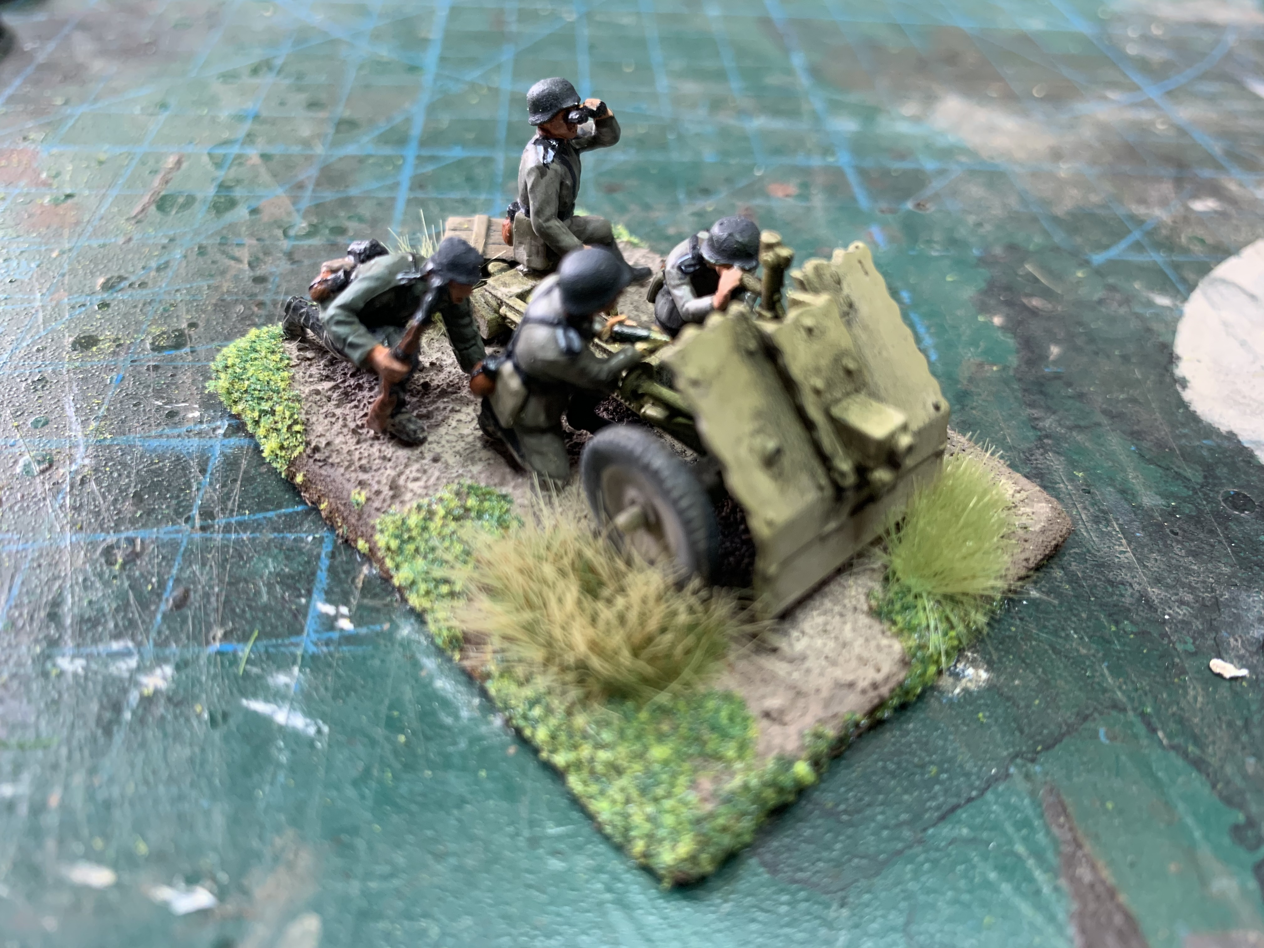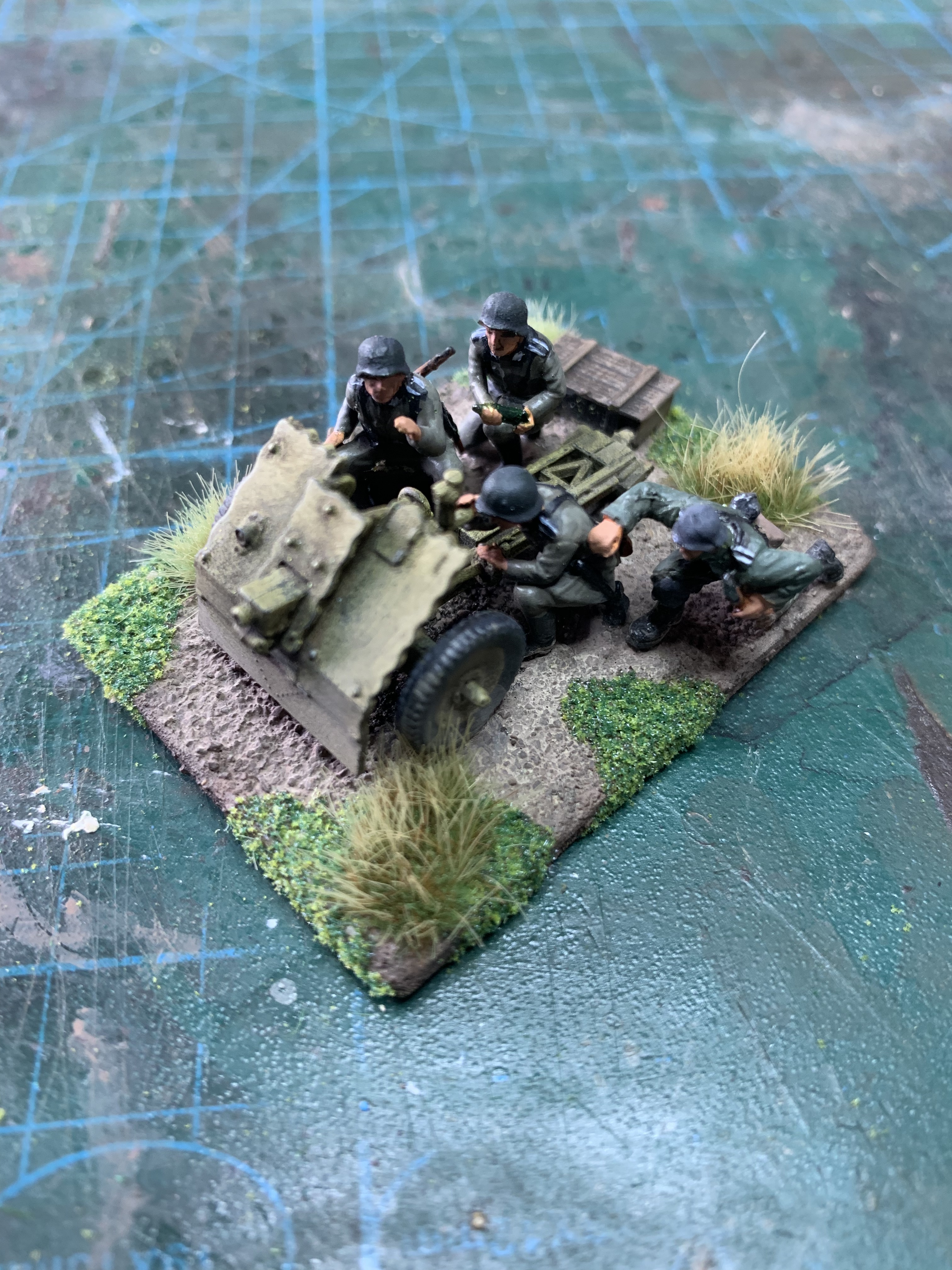 Zvezda make a heap of small scale kits including groups of troops and lots of armour and guns. They are super good value and perfect kits for wargamers. I built two of their German 75mm infantry guns in a matter of minutes as they come in minimal parts but do not sacrifice too much detail. It’s a soft grey plastic that glues nicely. There is a base supplied but I abandon those as prefer to do my own thing. Each gun comes with two crew figures, a loader and a gunner. I am sure the minimum crew for one of these would be more like four, so I pinched a couple of other crew men and just some kneeling troopers to bulk up my crew. The build was really easy and painting was just a coat of dark yellow and a brown wash. The crew took me a lot longer in various shades of field grey. I also added a box or two to the base for some added interest. I have a Zvezda Pak-40 sitting on the bench which will have some excellent AB crew painted up next.