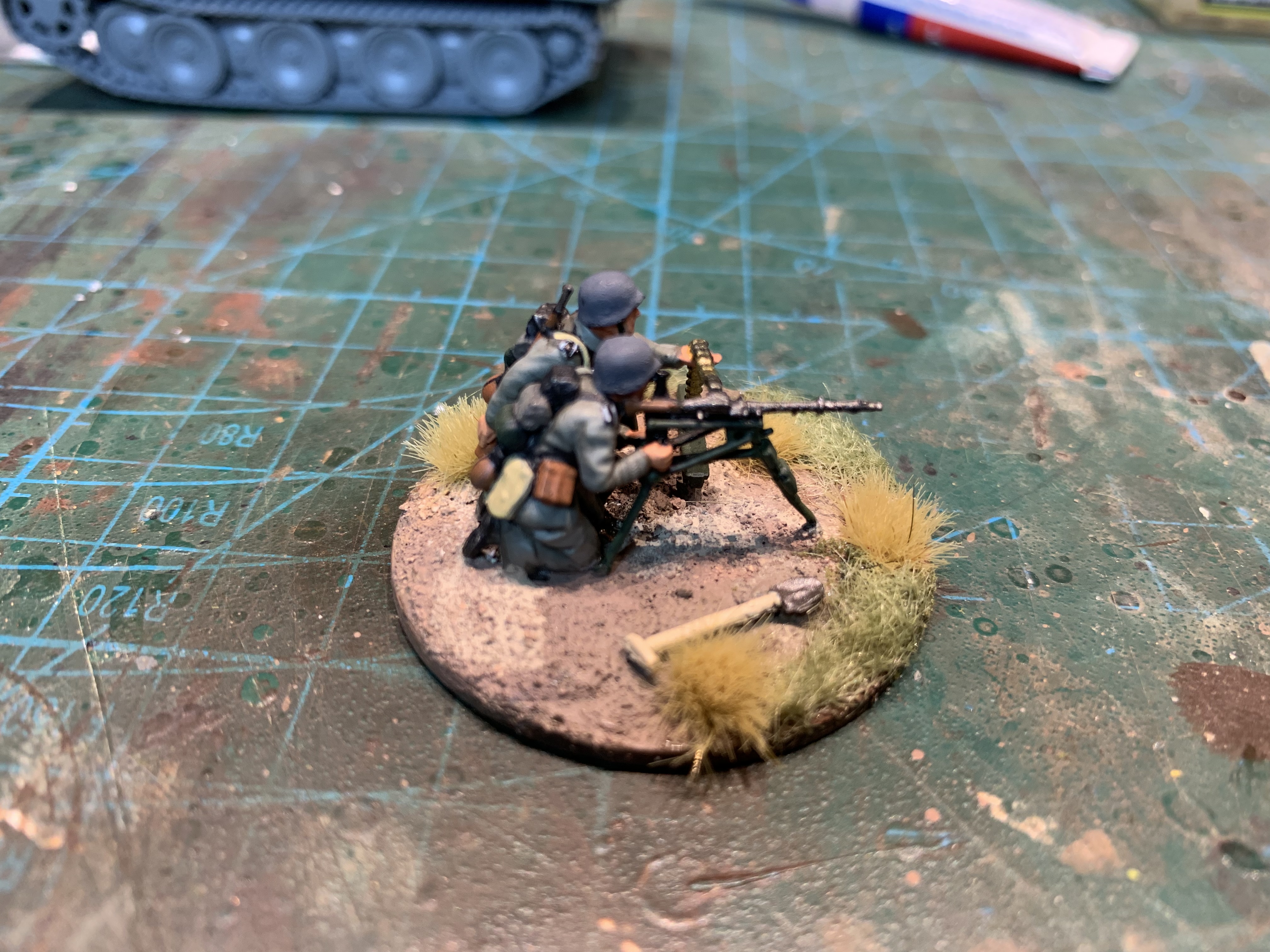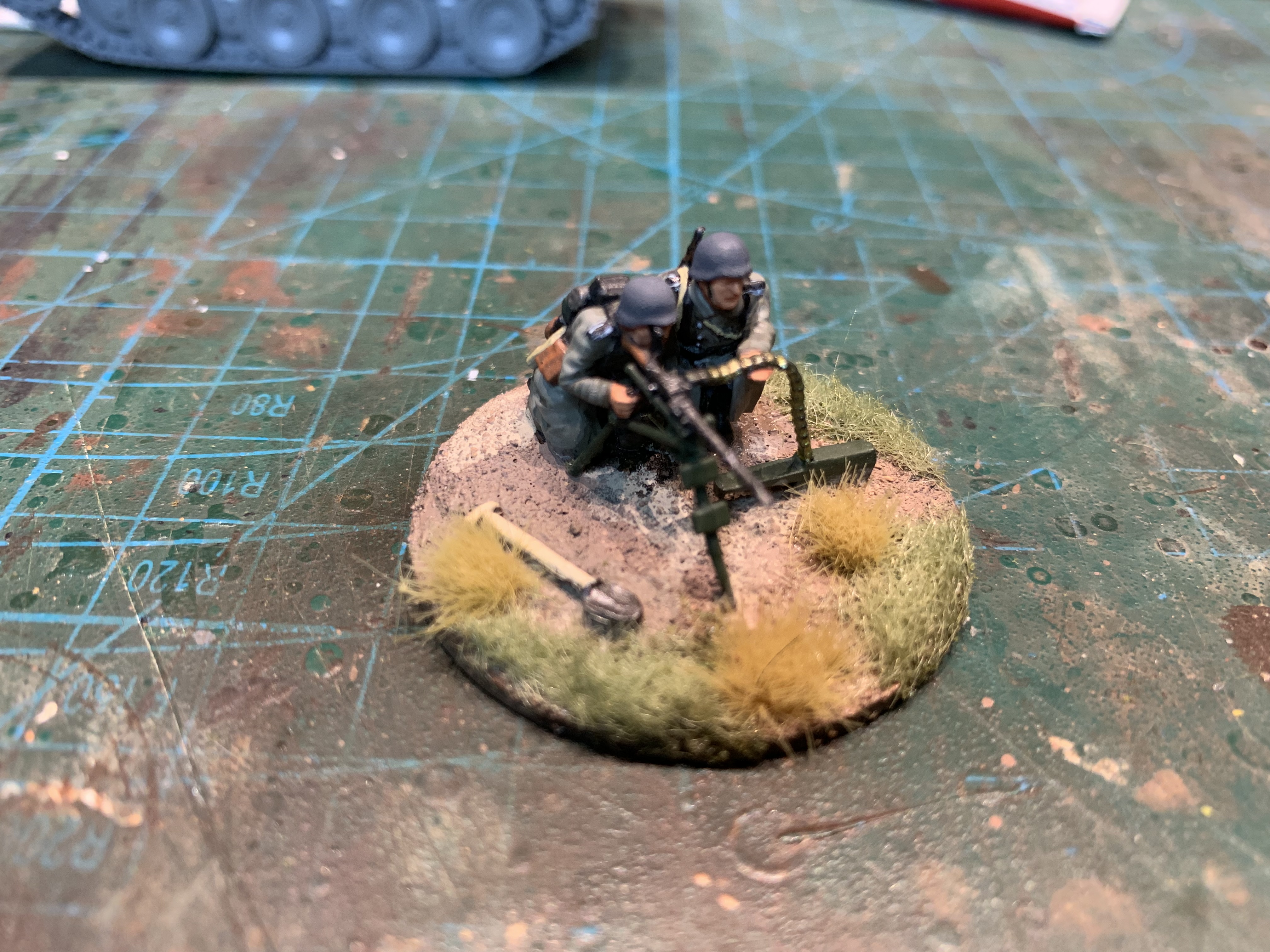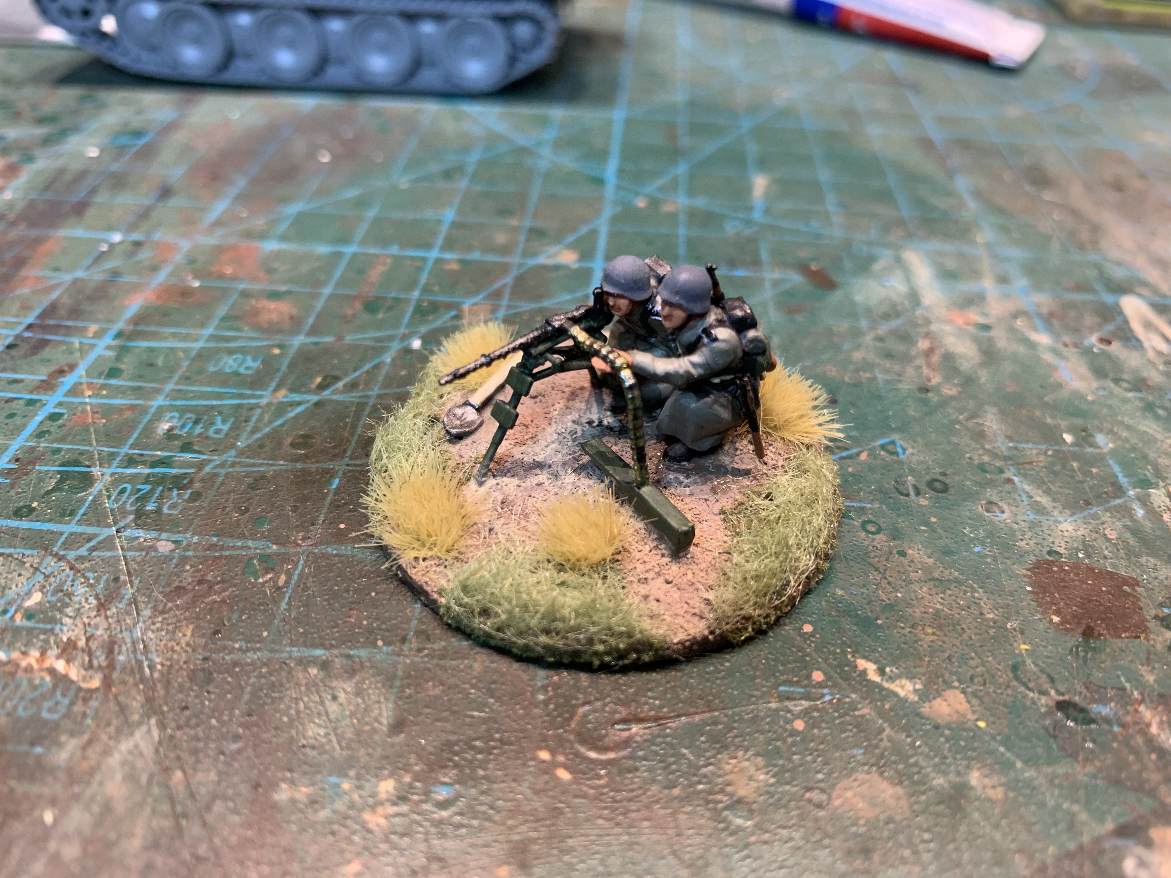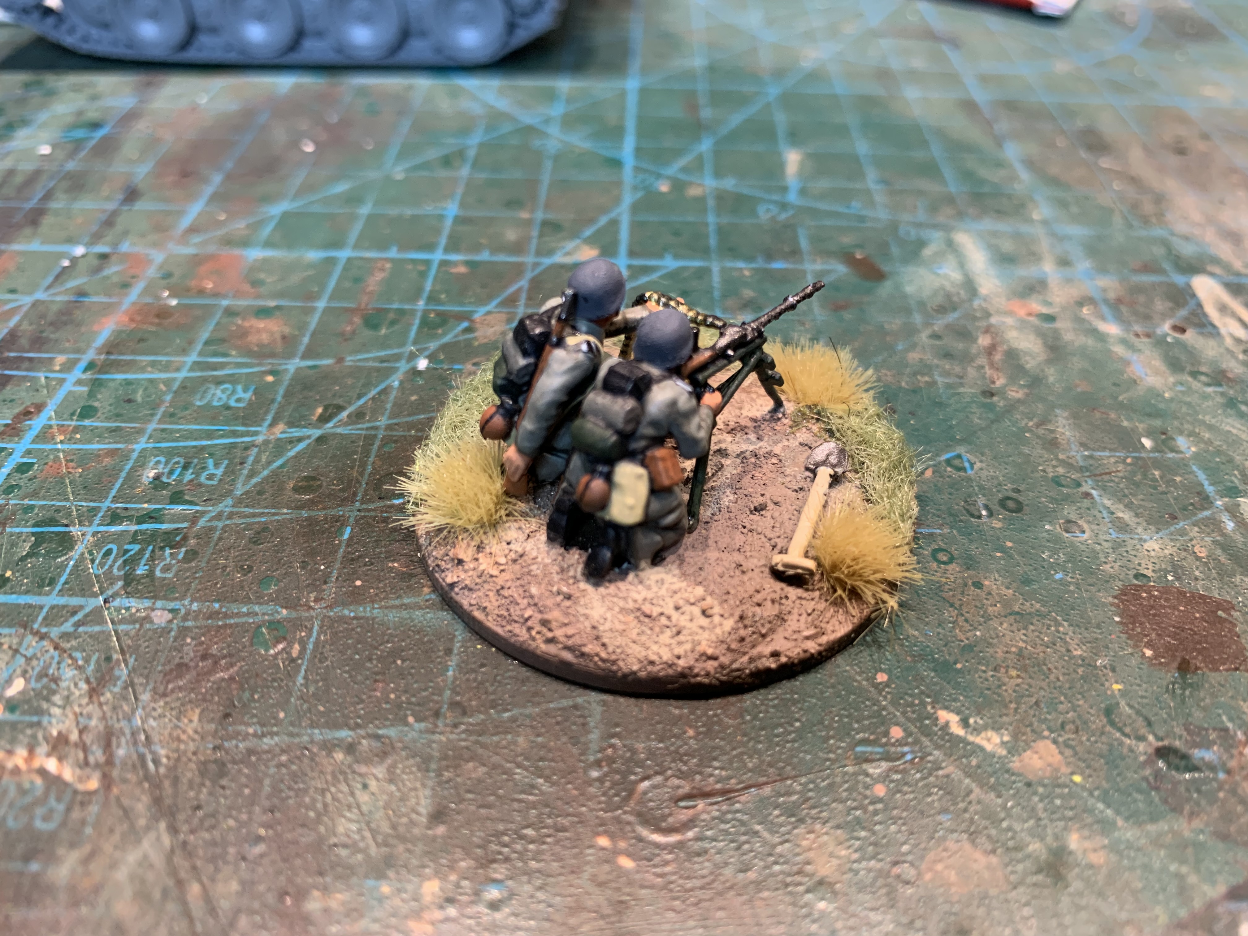 Just a quick post finishing off some stuff on my table! This is the kneeling MG team from Zvezda in their greatcoats. So for Normandy I guess these two guys were setting up early in the morning and have kept their jackets on. It’s another nice little combo from Zvezda – easy to put together a few arms and legs. Although I tend to cut off the limb plugs they have and just glue the arms on instead. Seems to be easier. They did come with a third crew man with binoculars but he ended up on one of my mortar teams (see previous post). These guys are painted with field grey jackets and grey pants and helmets. Based on my new plywood bases with some clay, sand and weathering powders. I also added a shovel just because. They can use that for digging in or toilet breaks, which will be necessary if they are waiting in ambush for hours. I used some tufts and had another go with static grass. Always tricky to make it stand up when you do not have a battery powered thingo. One day I will get around to making one or buying one for terrain stuff. I did use a charged balloon once which kind of worked.