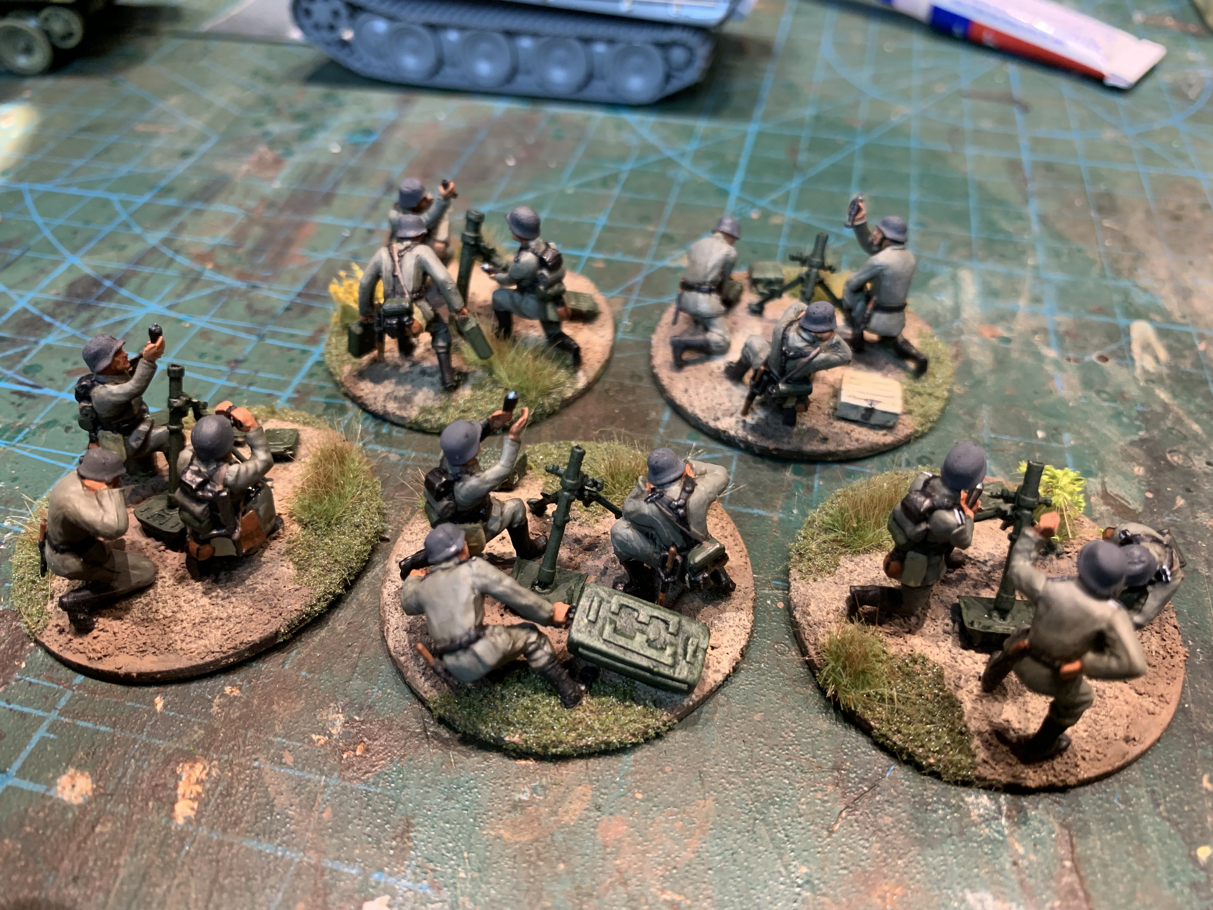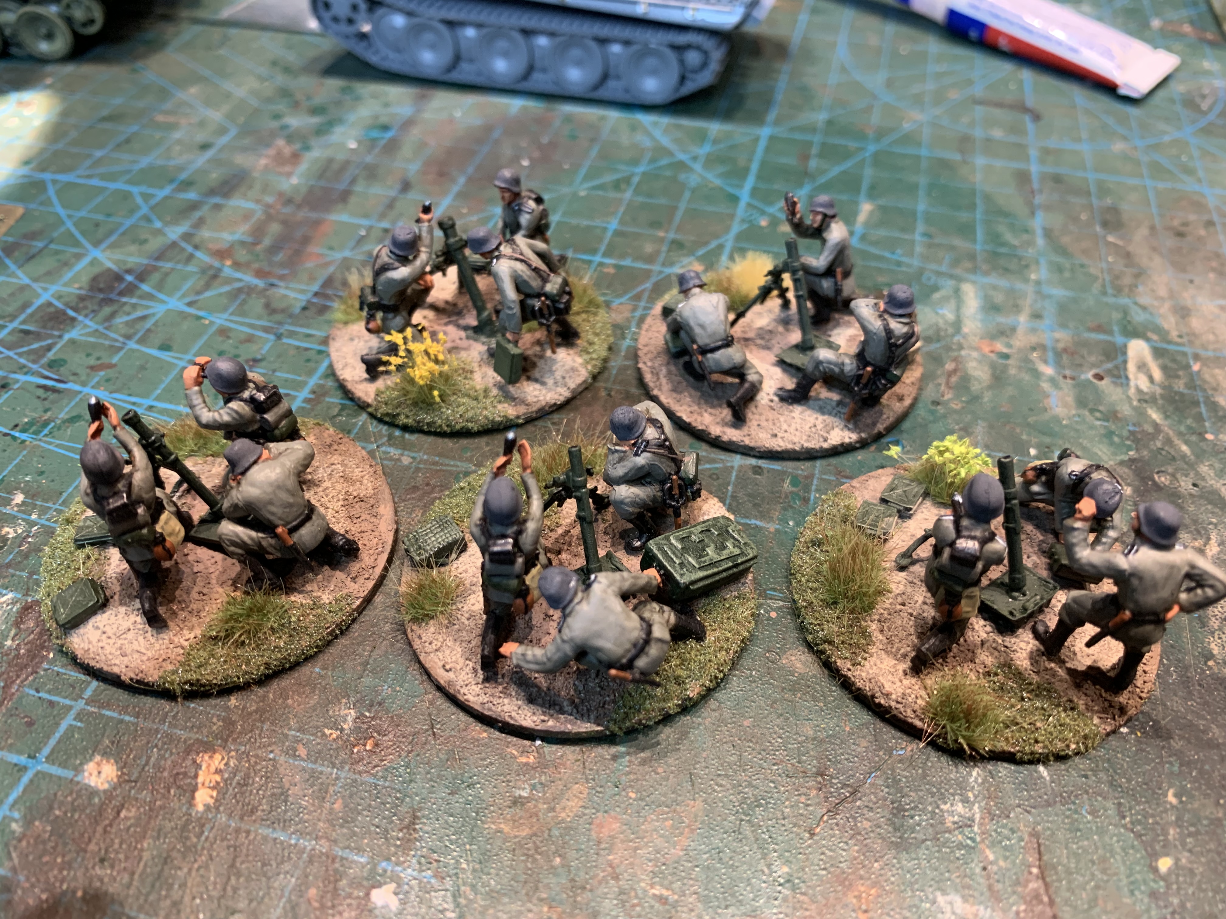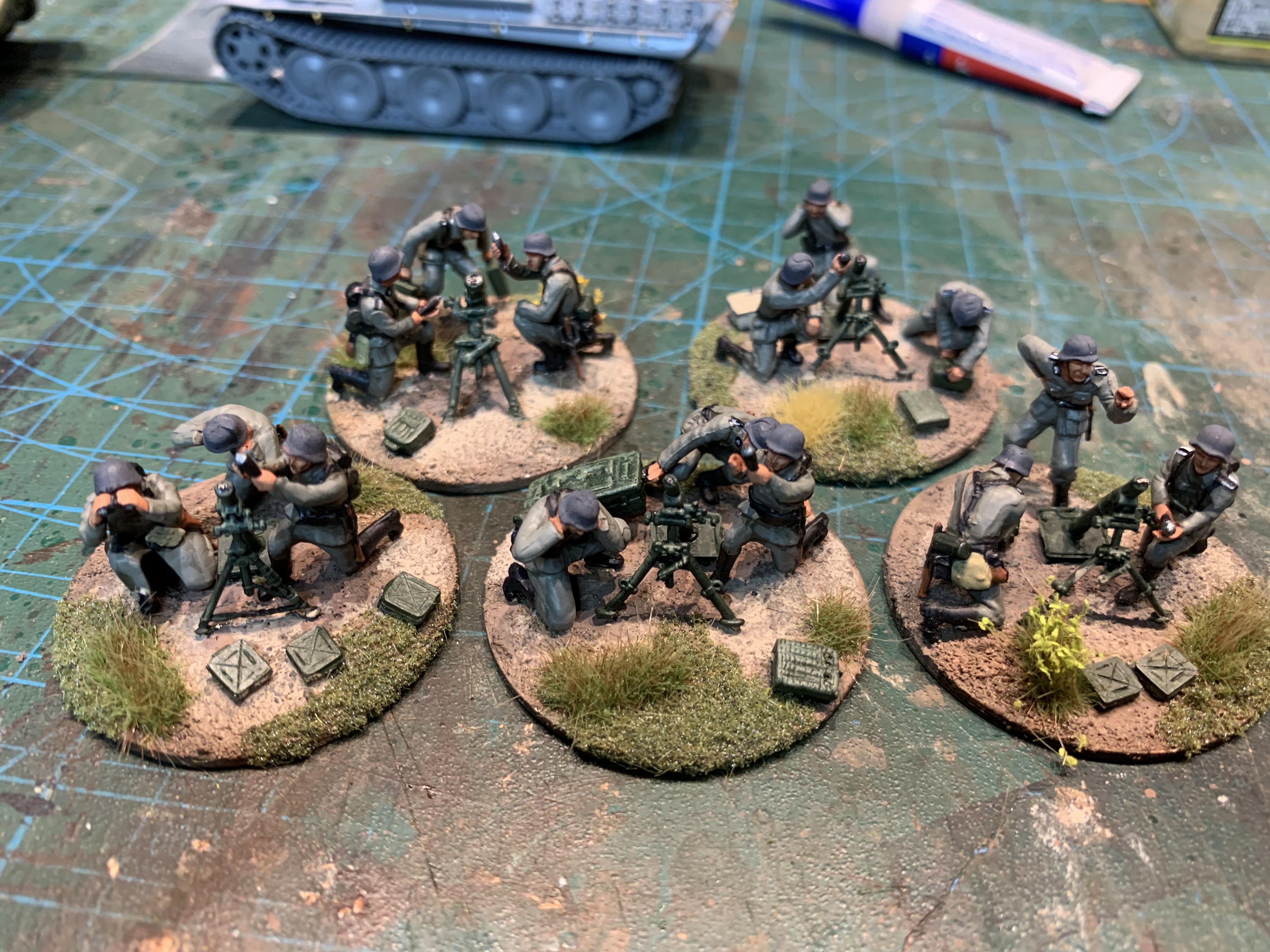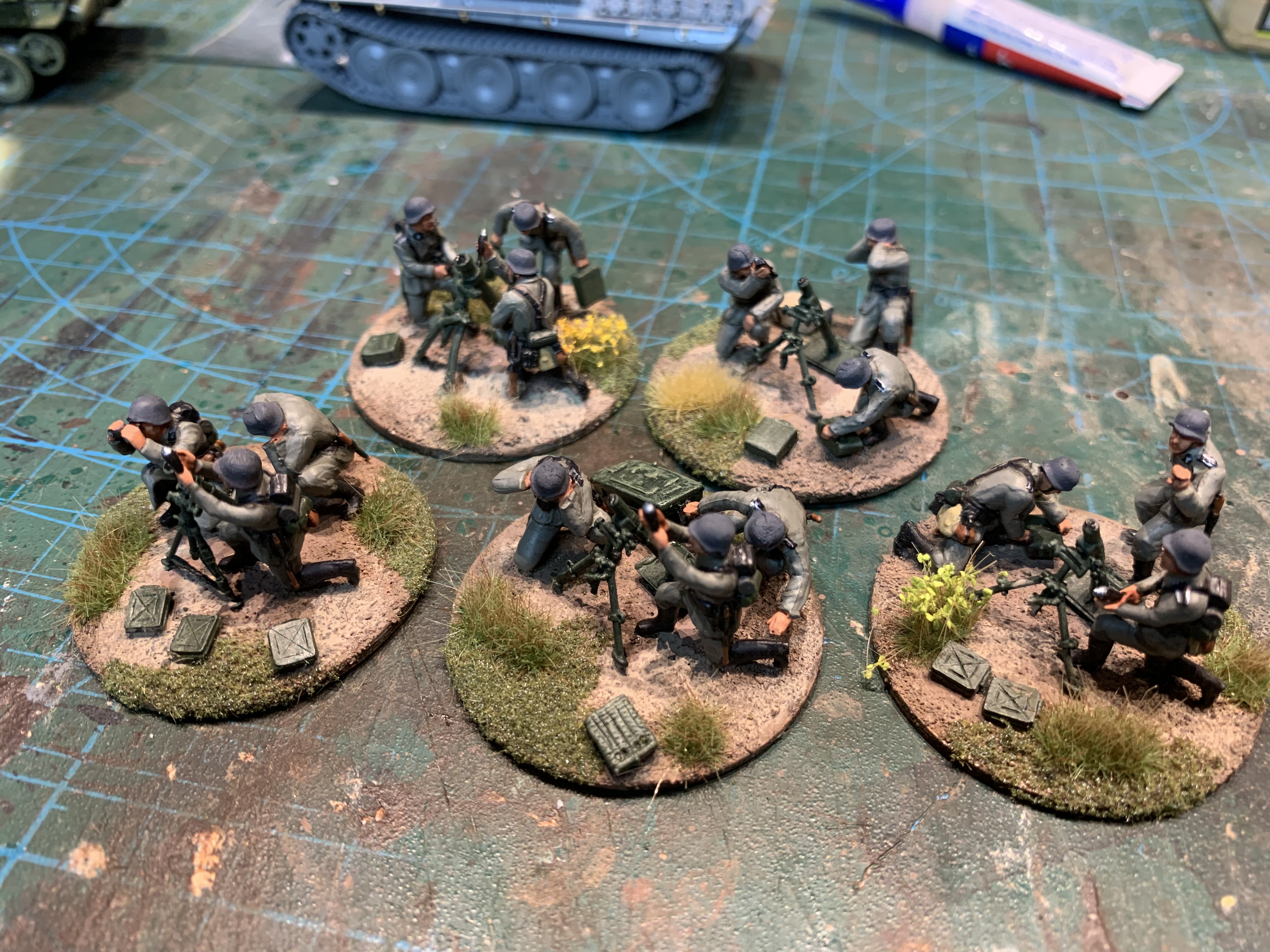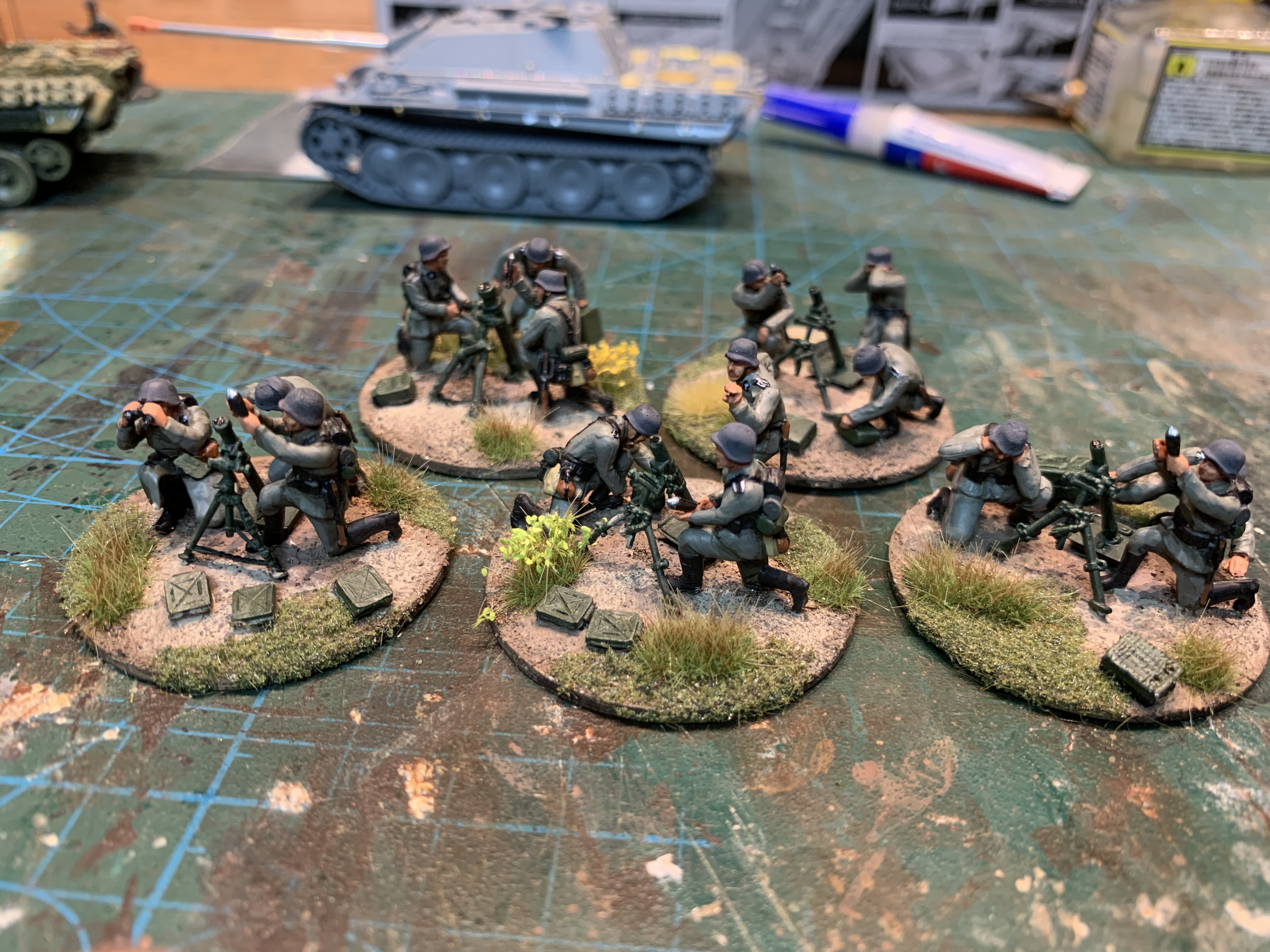 Just a quick post finishing off some stuff on my table! This is the kneeling MG team from Zvezda in their greatcoats. So for Normandy I guess these two guys were setting up early in the morning and have kept their jackets on. It’s another nice little combo from Zvezda – easy to put together a few arms and legs. Although I tend to cut off the limb plugs they have and just glue the arms on instead. Seems to be easier. They did come with a third crew man with binoculars but he ended up on one of my mortar teams (see previous post). These guys are painted with field grey jackets and grey pants and helmets. Based on my new plywood bases with some clay, sand and weathering powders. I also added a shovel just because. They can use that for digging in or toilet breaks, which will be necessary if they are waiting in ambush for hours. I used some tufts and had another go with static grass. Always tricky to make it stand up when you do not have a battery powered thingo. One day I will get around to making one or buying one for terrain stuff. I did use a charged balloon once which kind of worked.