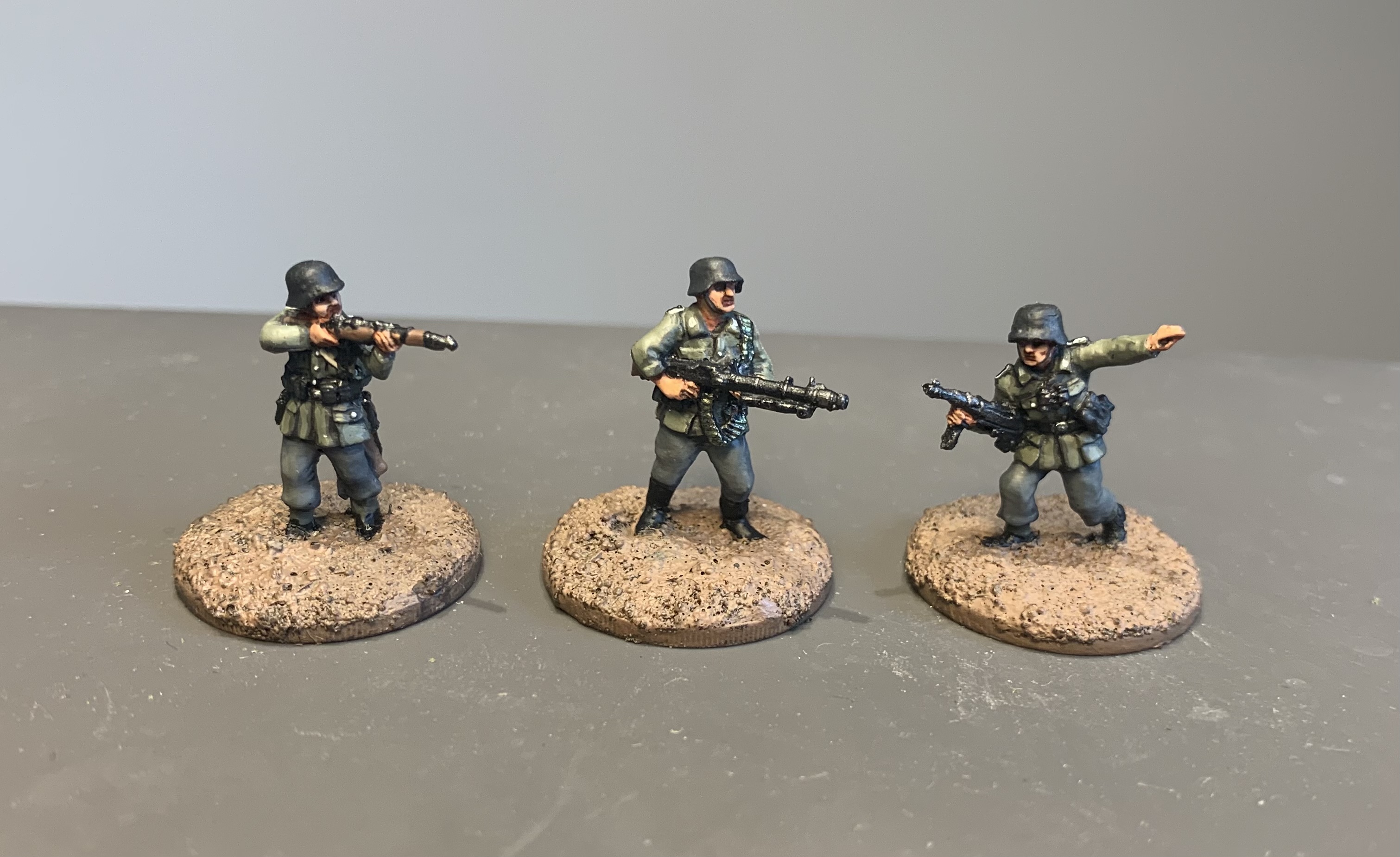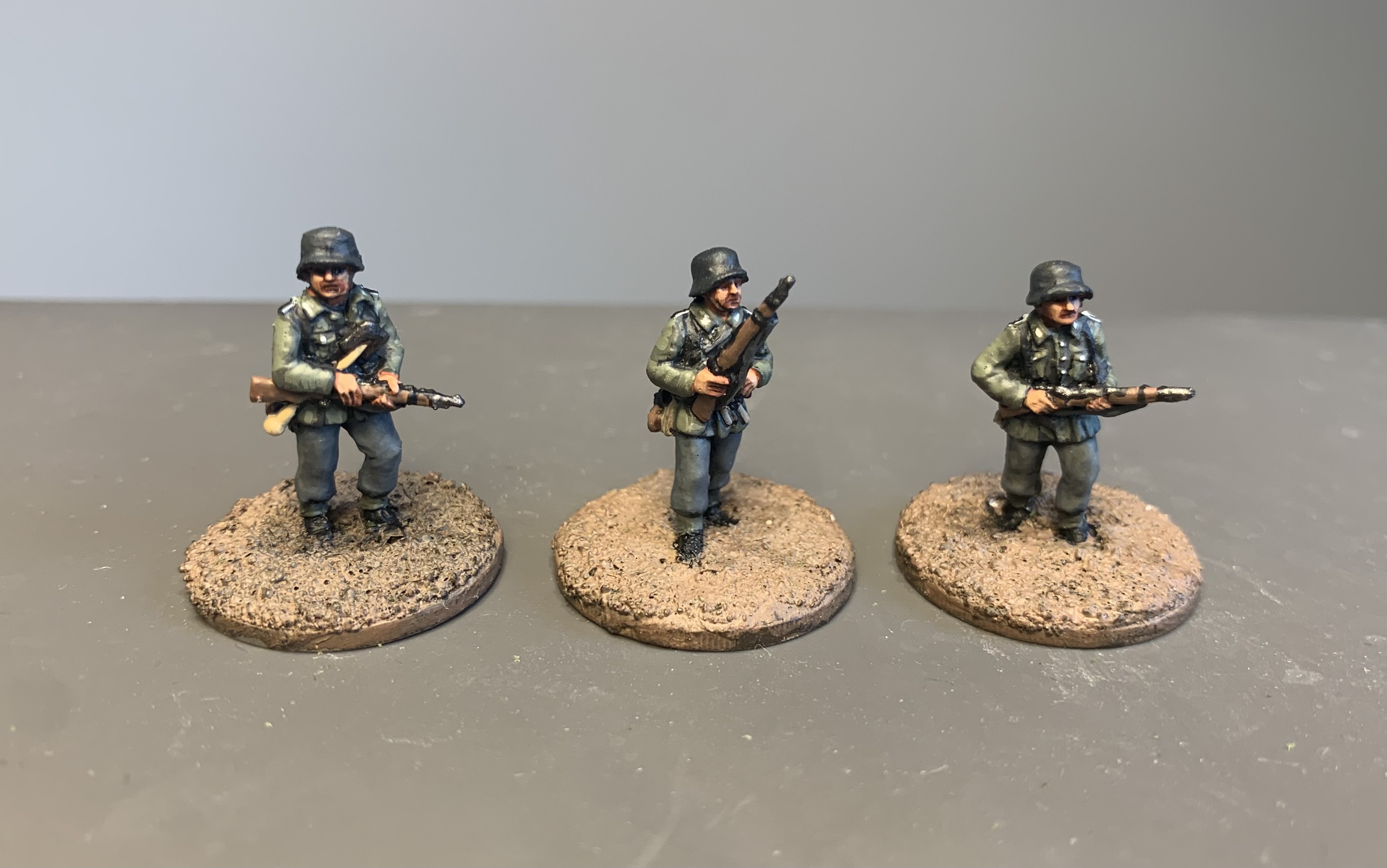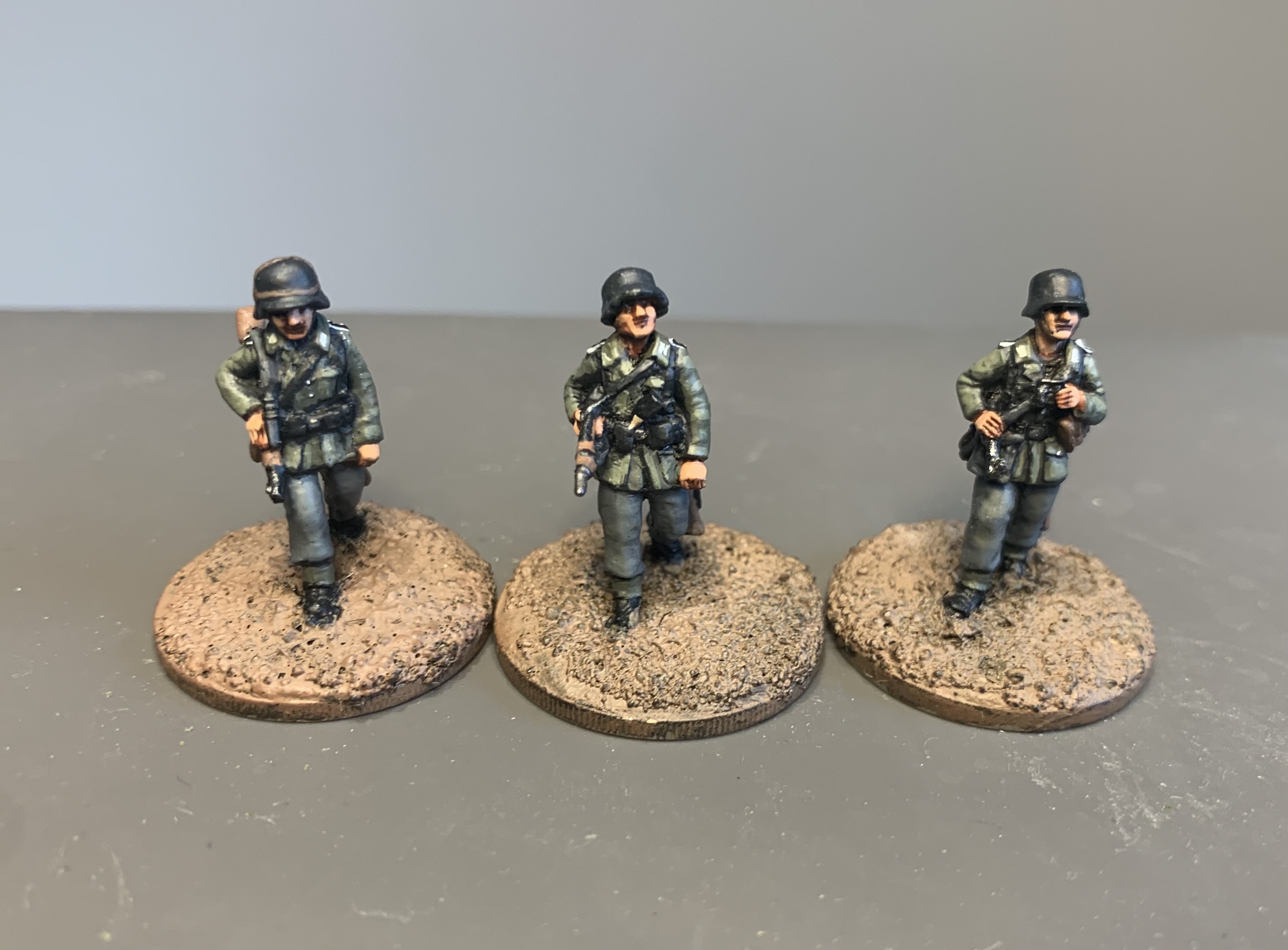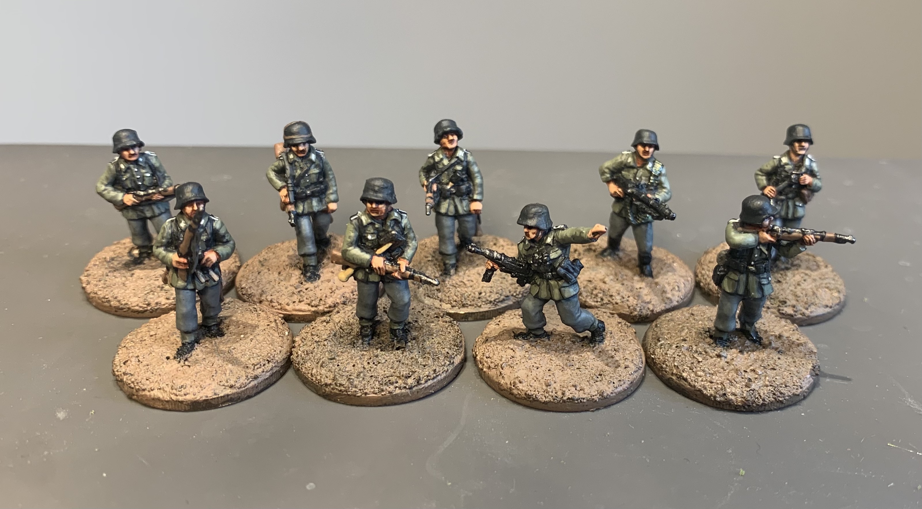 My plan for 2023 is to get all my German infantry painted up. There are 150 or so of them knocking around and most are already based and primed ready to go! Most of my British are completed so its about time I have some opposition to actually get a game set up and even played. This group consist of nine infantry including a standing machine gunner, seven rifle men mostly walking and one officer with an MP40. I also snuck in a senior officer from CP models. For my paint job I used paints from a German Uniform Field Grey paint set I recently purchased, with the jackets and pants being interesting different shades. Reading around about German uniforms it seems that there were many different shades throughout the war, so any inaccuracies are totally accurate. Makes it easy to do whatever shades you like. I love the poses and stances of these AB figures, and the detail makes it so much easier to paint. It still takes me days just to paint a few…….and that’s not even doing camo…….