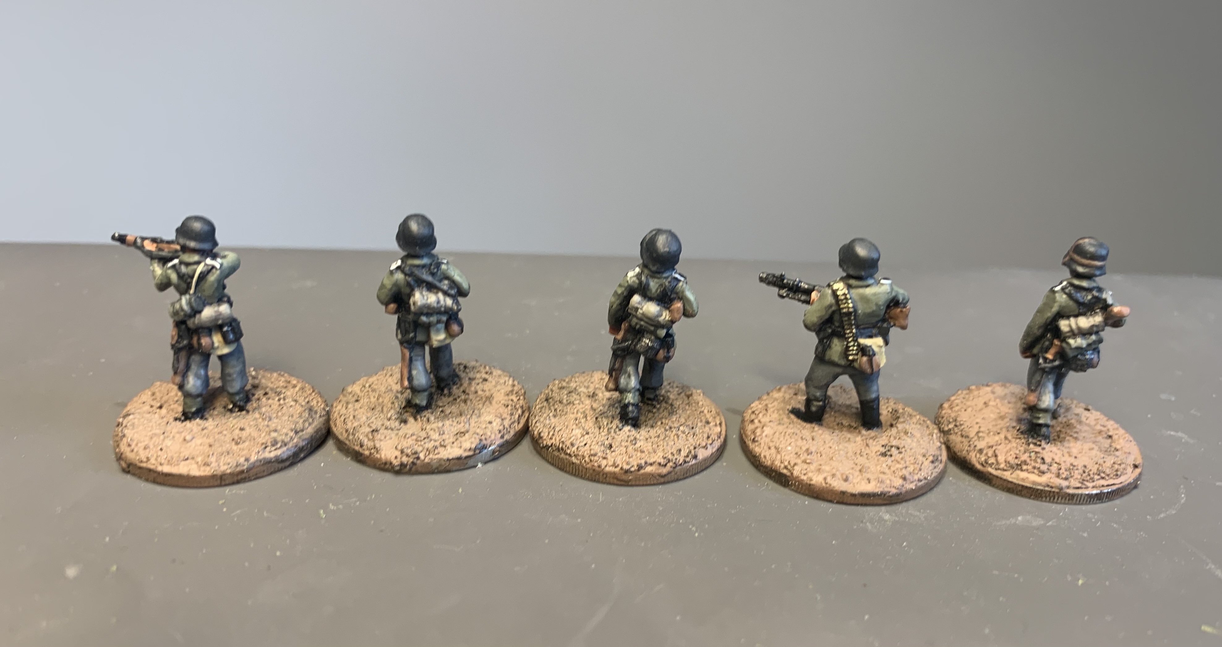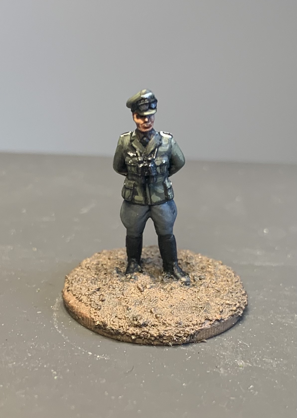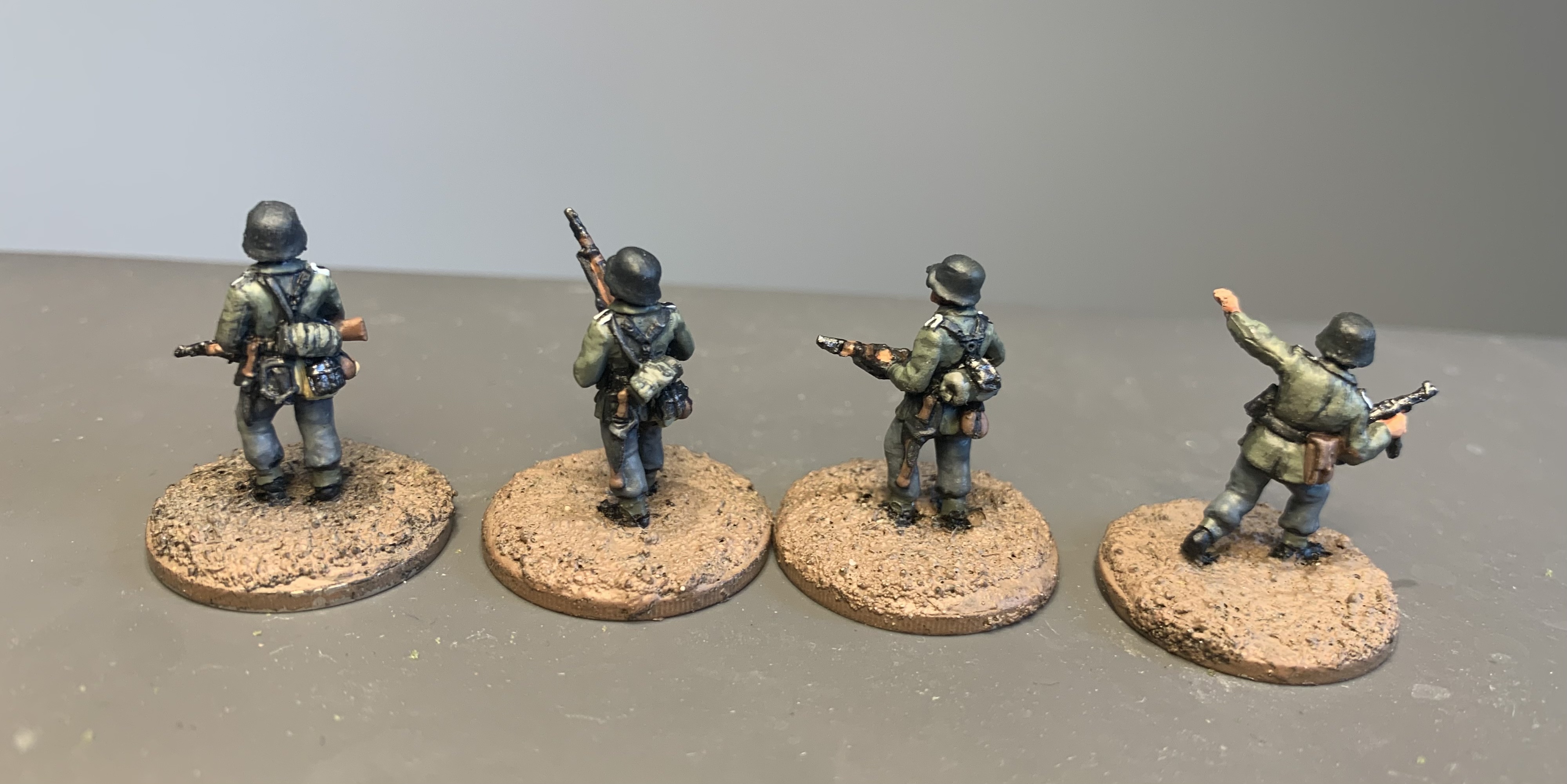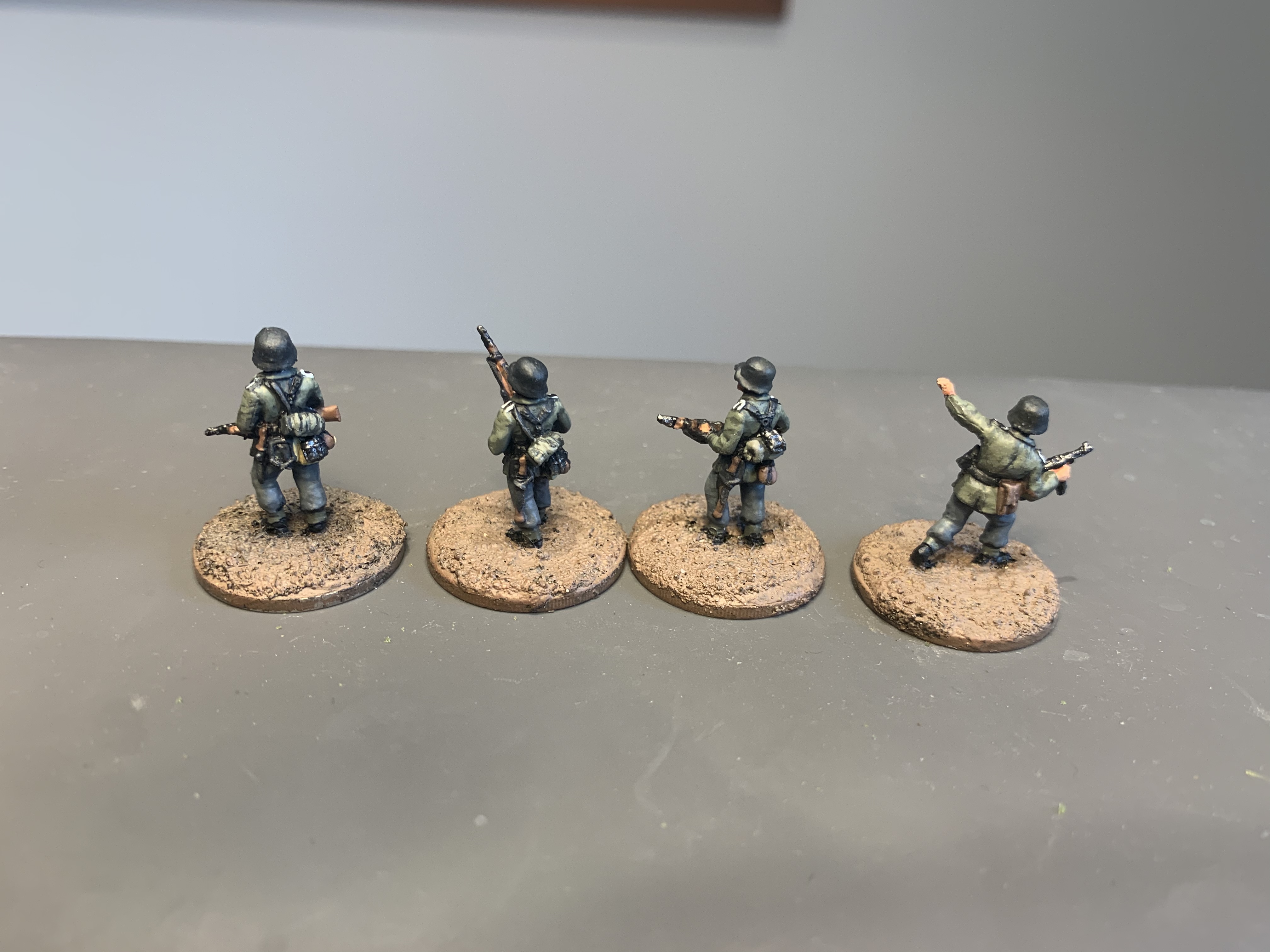 My plan for 2023 is to get all my German infantry painted up. There are 150 or so of them knocking around and most are already based and primed ready to go! Most of my British are completed so its about time I have some opposition to actually get a game set up and even played. This group consist of nine infantry including a standing machine gunner, seven rifle men mostly walking and one officer with an MP40. I also snuck in a senior officer from CP models. For my paint job I used paints from a German Uniform Field Grey paint set I recently purchased, with the jackets and pants being interesting different shades. Reading around about German uniforms it seems that there were many different shades throughout the war, so any inaccuracies are totally accurate. Makes it easy to do whatever shades you like. I love the poses and stances of these AB figures, and the detail makes it so much easier to paint. It still takes me days just to paint a few…….and that’s not even doing camo…….