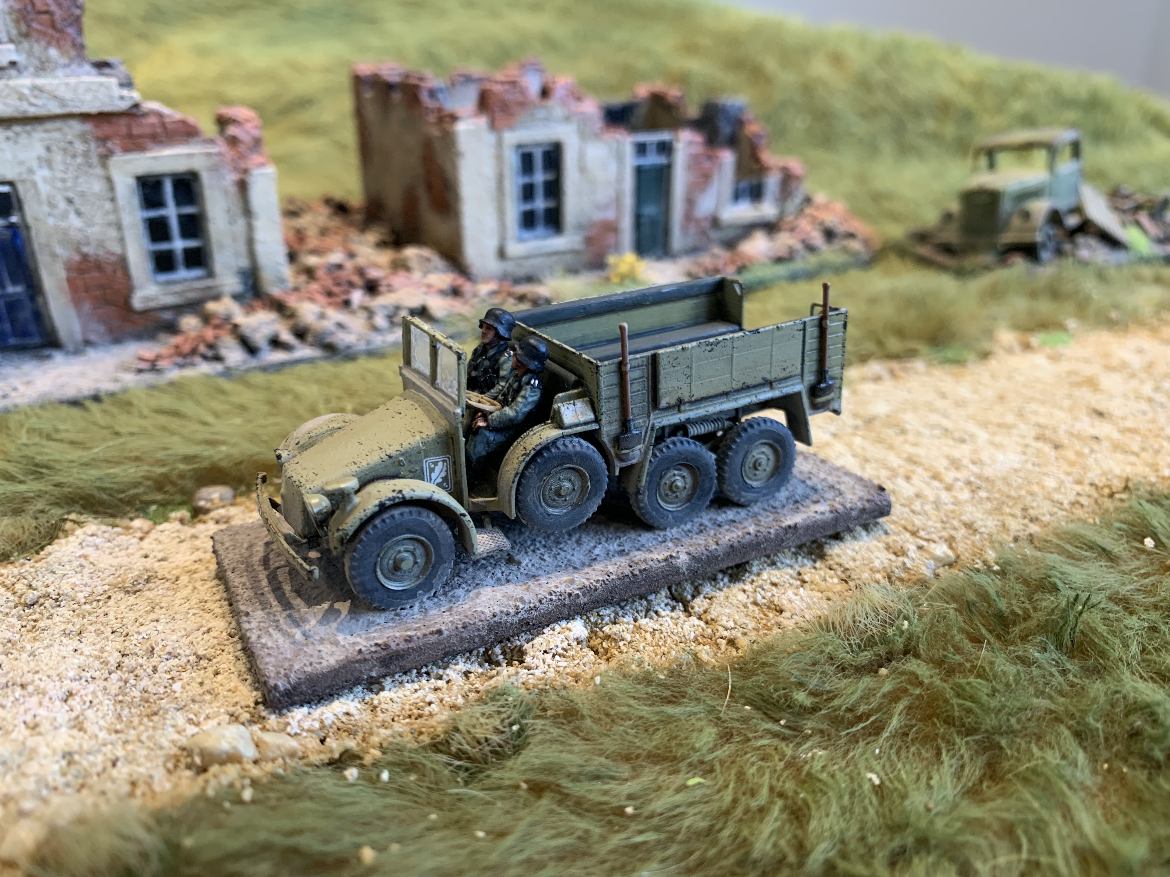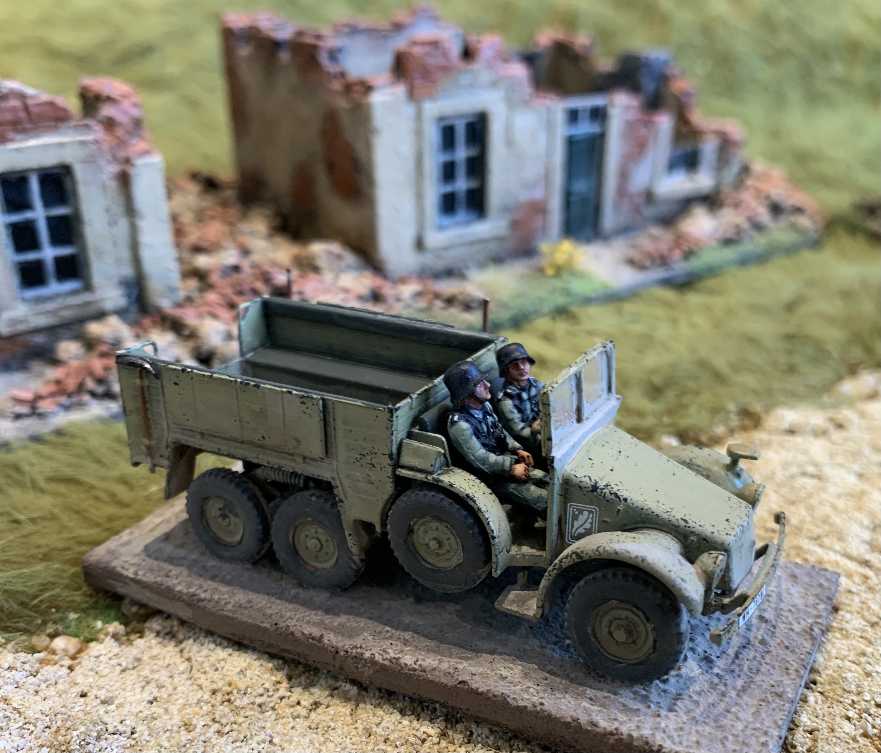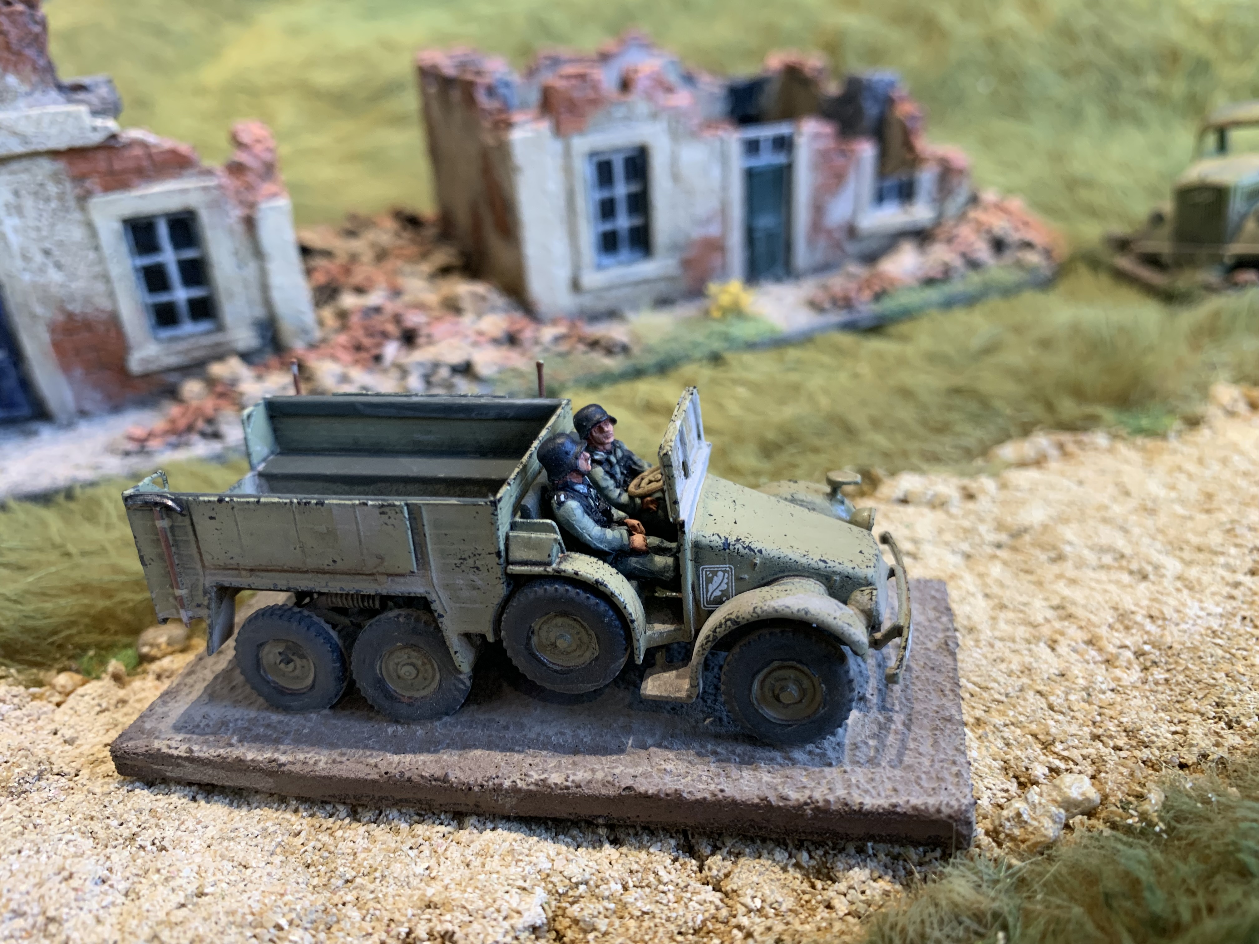 I had already built a very nice version of this vehicle from Dragon Models, and was so keen to try another one, this time from ICM. Cheaper than its Dragon peers, but as usual you get what you pay for. I did not enjoy building this kit. The worst bit are the rear axles and suspension which are overly complex and delicate. I had to add some extra plastic to shore everything up, and also managed to lose and break plenty of the bits. It is all underneath and invisible anyway so a whole lot of stress and time wasted over nothing. I don’t remember what else was particularly annoying, I think the instructions and lack of numbering on the parts also just bugs me. Also, pretty grumpy this week fighting some nasty flu so annoying kits not getting much love. …… On the good side, once you have finished the frustrating build, it does turn into a nice little truck. I added some thin plastic for the windshield, and if I had more patience would have put some wipers on there too. I did a dusty windscreen and removed the areas where the wipers would have wiped. Did a plain dark yellow paint job and some chipping with a spongey sponge. The drivers are from AB Figures of course and always look the part. I have six SS dudes in Autumn camo ready to load up into the back, will take a photo of the full truck when I can. So I think these days I am just getting a bit fussy over kits that are annoying to build. There is a big difference between a challenging kit and an annoying kit………..
