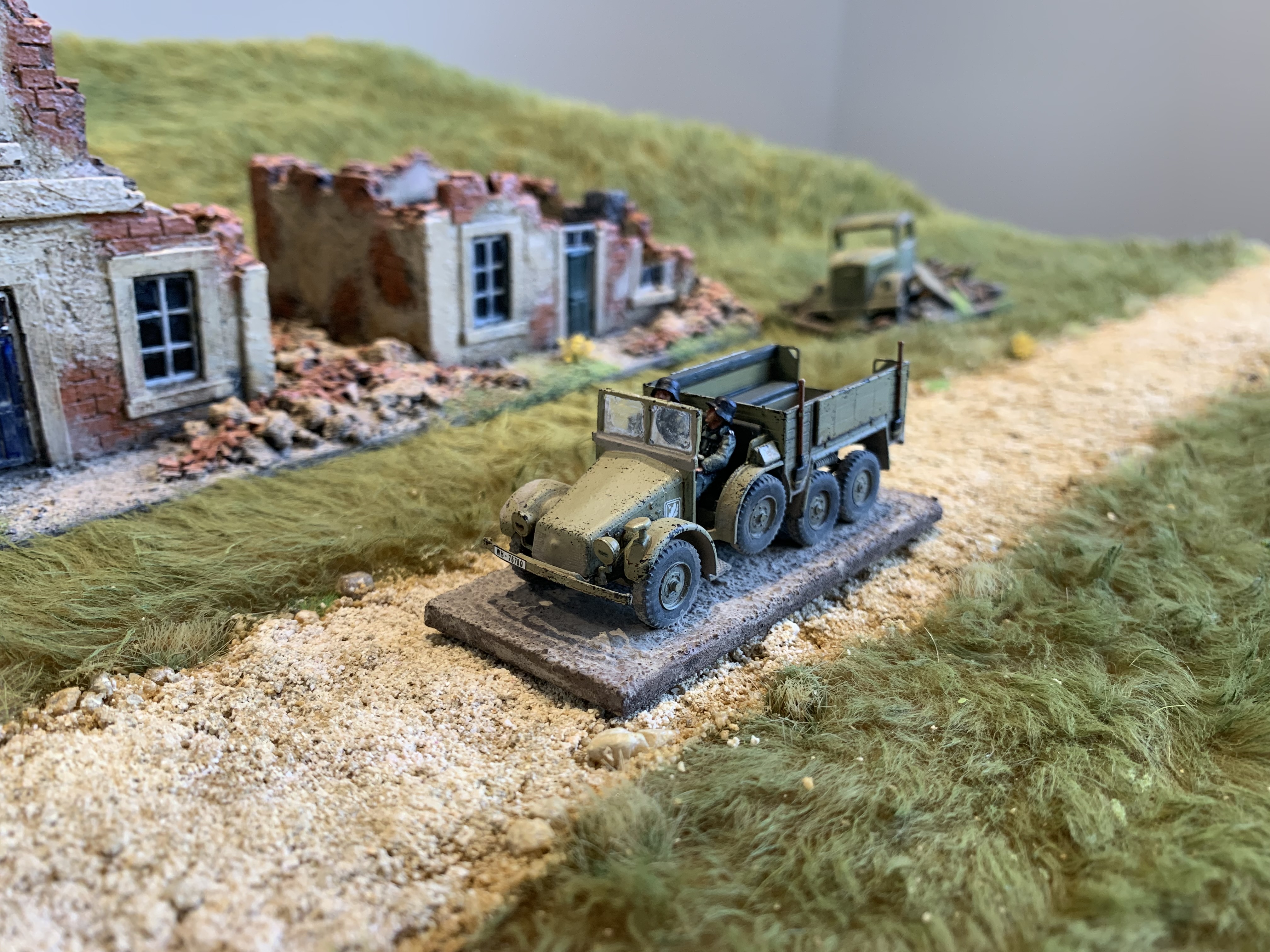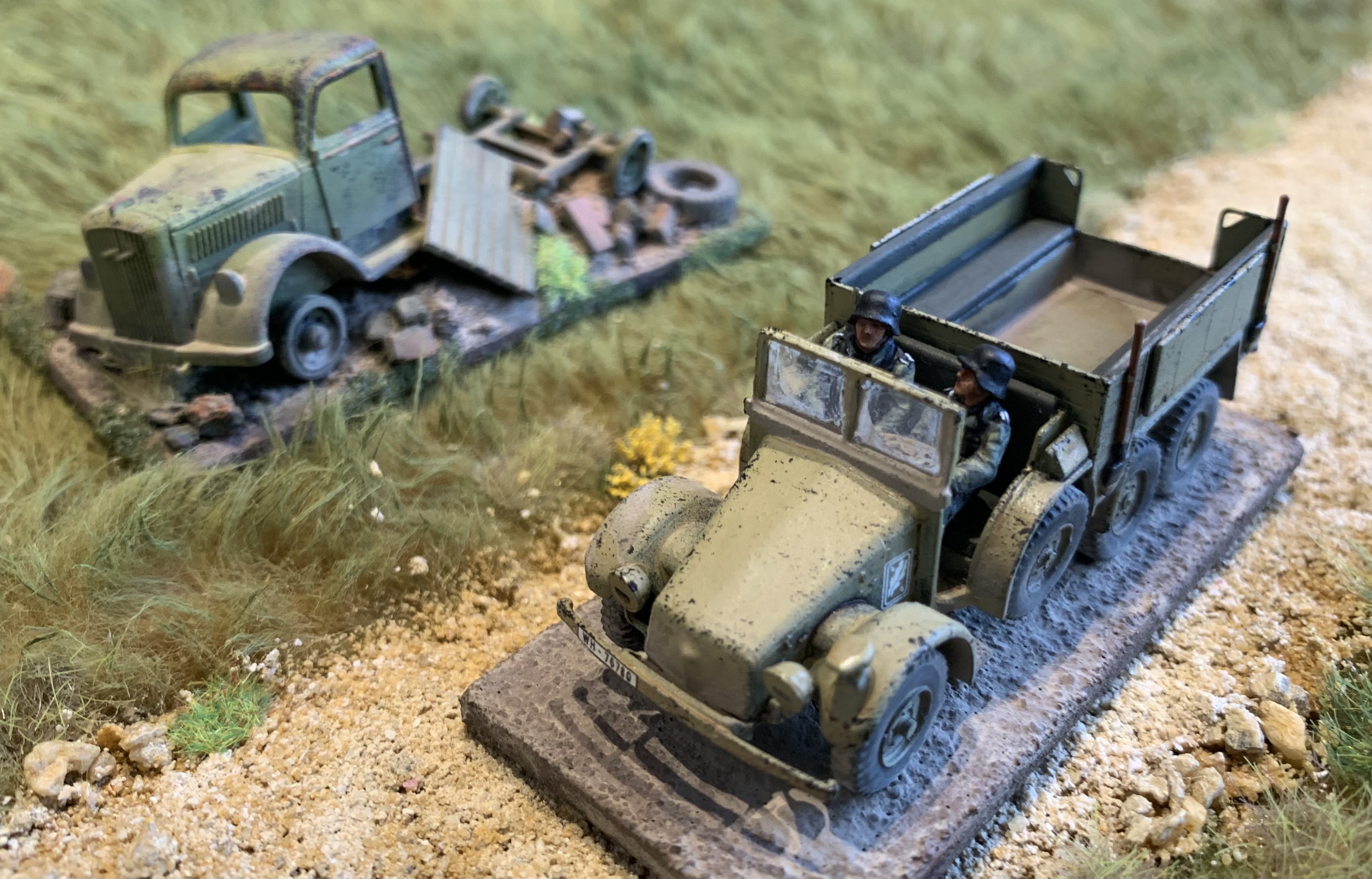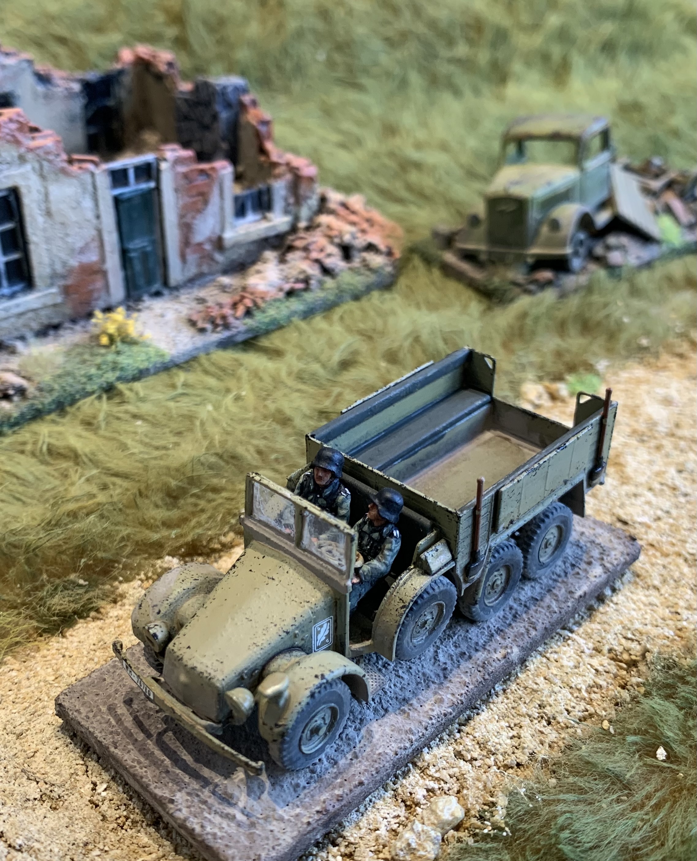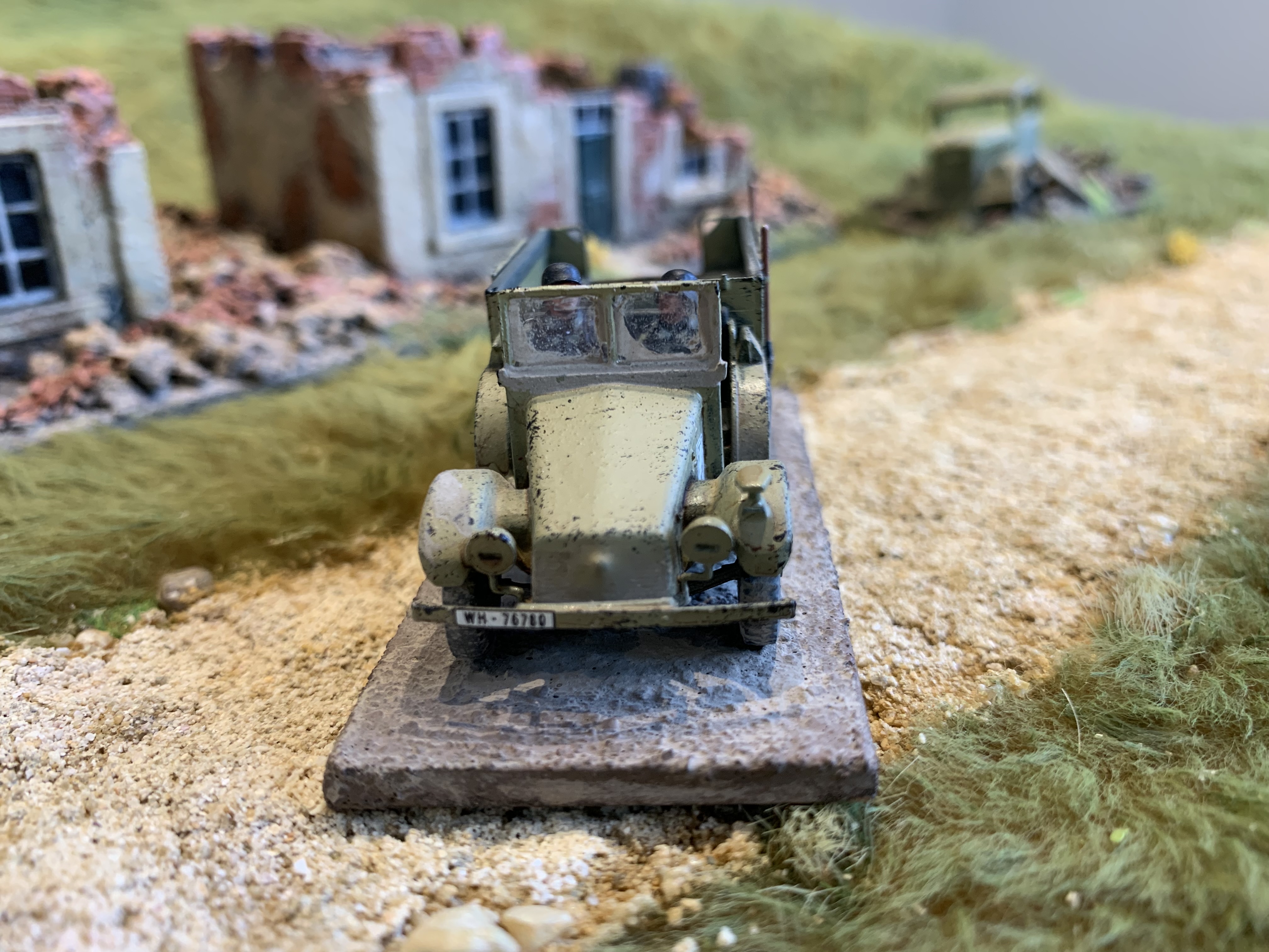 I had already built a very nice version of this vehicle from Dragon Models, and was so keen to try another one, this time from ICM. Cheaper than its Dragon peers, but as usual you get what you pay for. I did not enjoy building this kit. The worst bit are the rear axles and suspension which are overly complex and delicate. I had to add some extra plastic to shore everything up, and also managed to lose and break plenty of the bits. It is all underneath and invisible anyway so a whole lot of stress and time wasted over nothing. I don’t remember what else was particularly annoying, I think the instructions and lack of numbering on the parts also just bugs me. Also, pretty grumpy this week fighting some nasty flu so annoying kits not getting much love. …… On the good side, once you have finished the frustrating build, it does turn into a nice little truck. I added some thin plastic for the windshield, and if I had more patience would have put some wipers on there too. I did a dusty windscreen and removed the areas where the wipers would have wiped. Did a plain dark yellow paint job and some chipping with a spongey sponge. The drivers are from AB Figures of course and always look the part. I have six SS dudes in Autumn camo ready to load up into the back, will take a photo of the full truck when I can. So I think these days I am just getting a bit fussy over kits that are annoying to build. There is a big difference between a challenging kit and an annoying kit………..