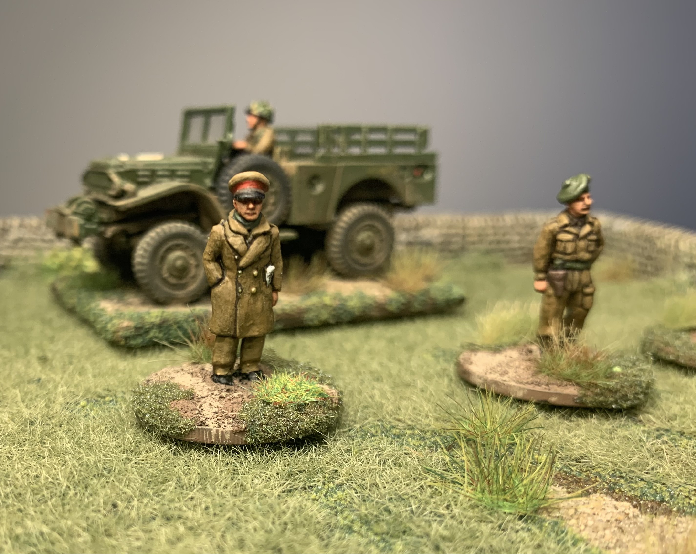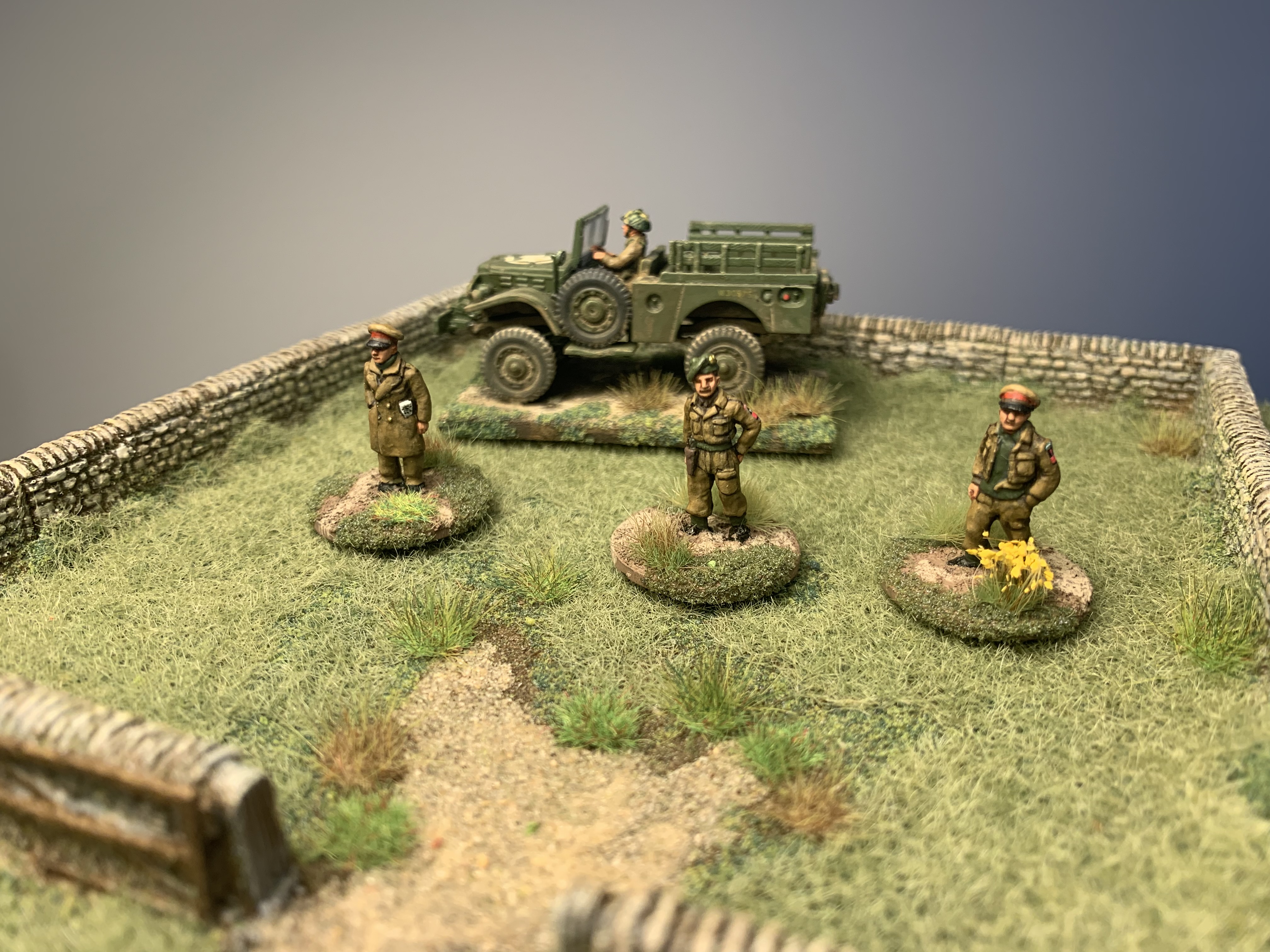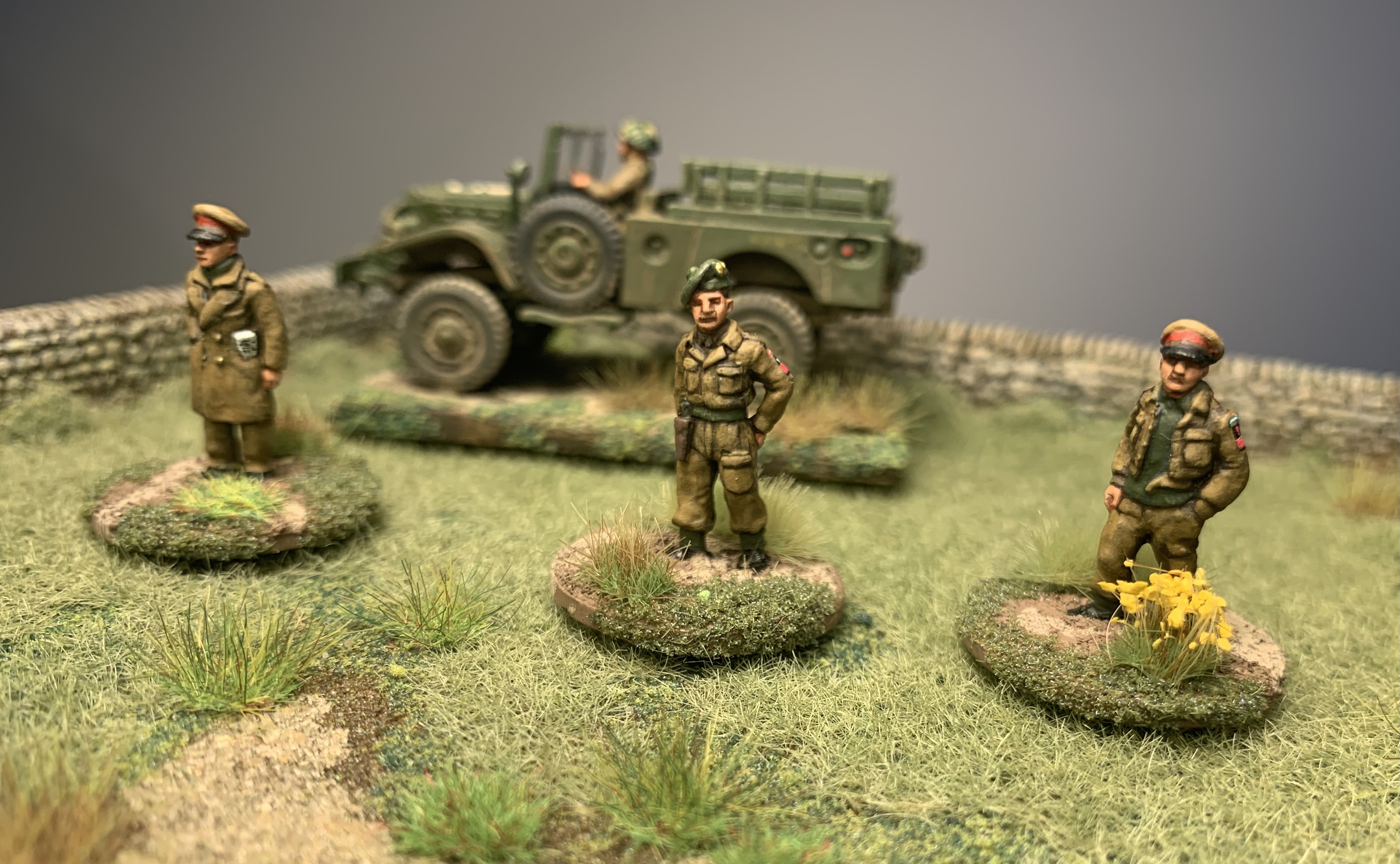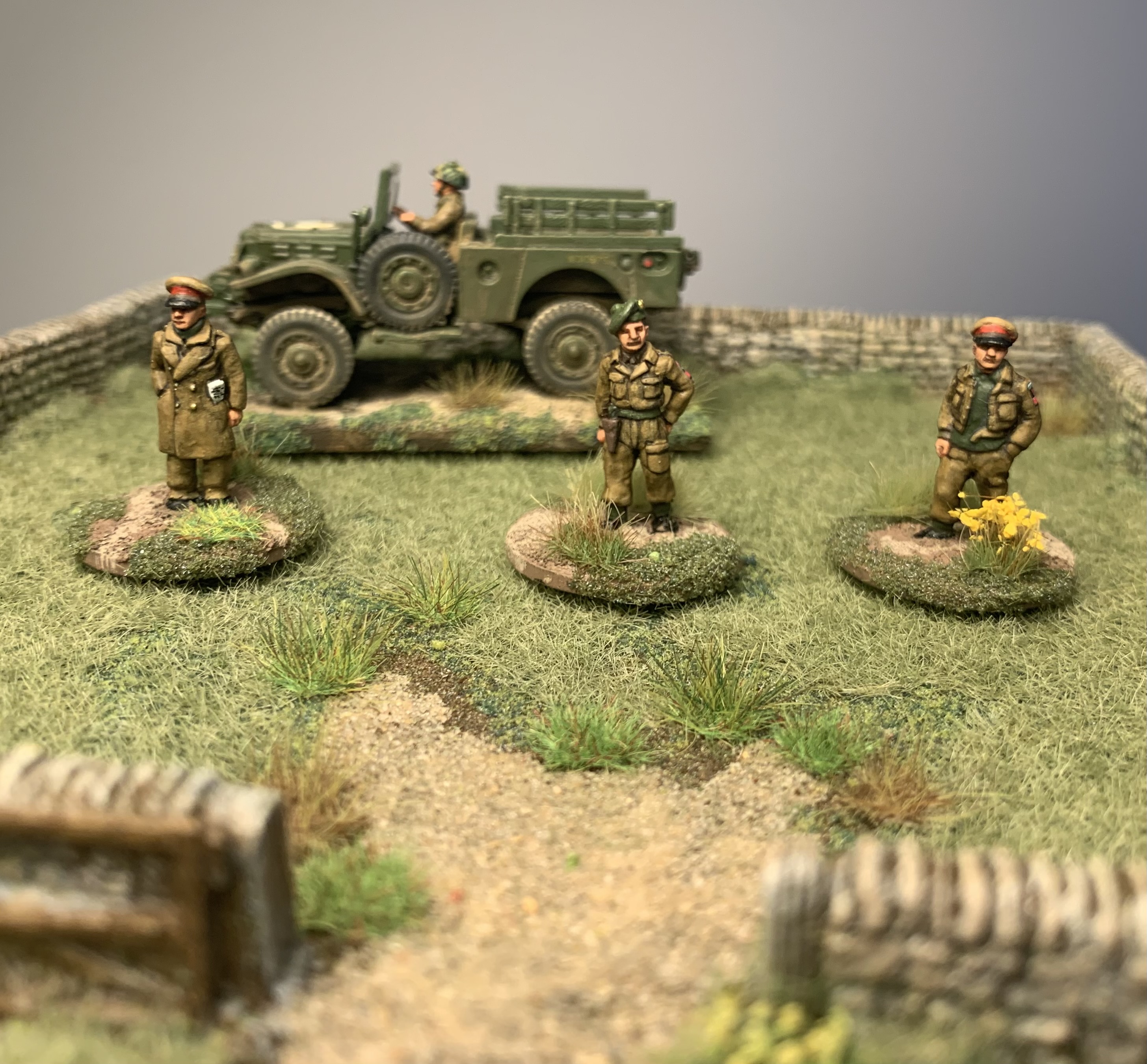 I had a trio of AB Figures British Army officers all based and primed and ready to hit the painting area. Finally while soaking up the excitement of Ashes cricket they were finished! Colonel Bairstow on the left, Captain Stokes in the middle and a casual General Crawley on the right. As always love painting AB figures, the detail is so good they make it easy. The poses are relaxed and natural, I especially like the folded newspaper or betting guide in the Colonel’s pocket. I used custom decals from Company B for their shoulder insignia as that is getting too small for my painting skills and eyes. My eyes are old and grey…… Usual British colours with three shades. Nice gold buttons too on the Colonel’s jacket. Behind is a Dodge weapons carrier from Italeri, a kit that is quite rare these days. Shame they don’t re-release it as I would buy a couple more.