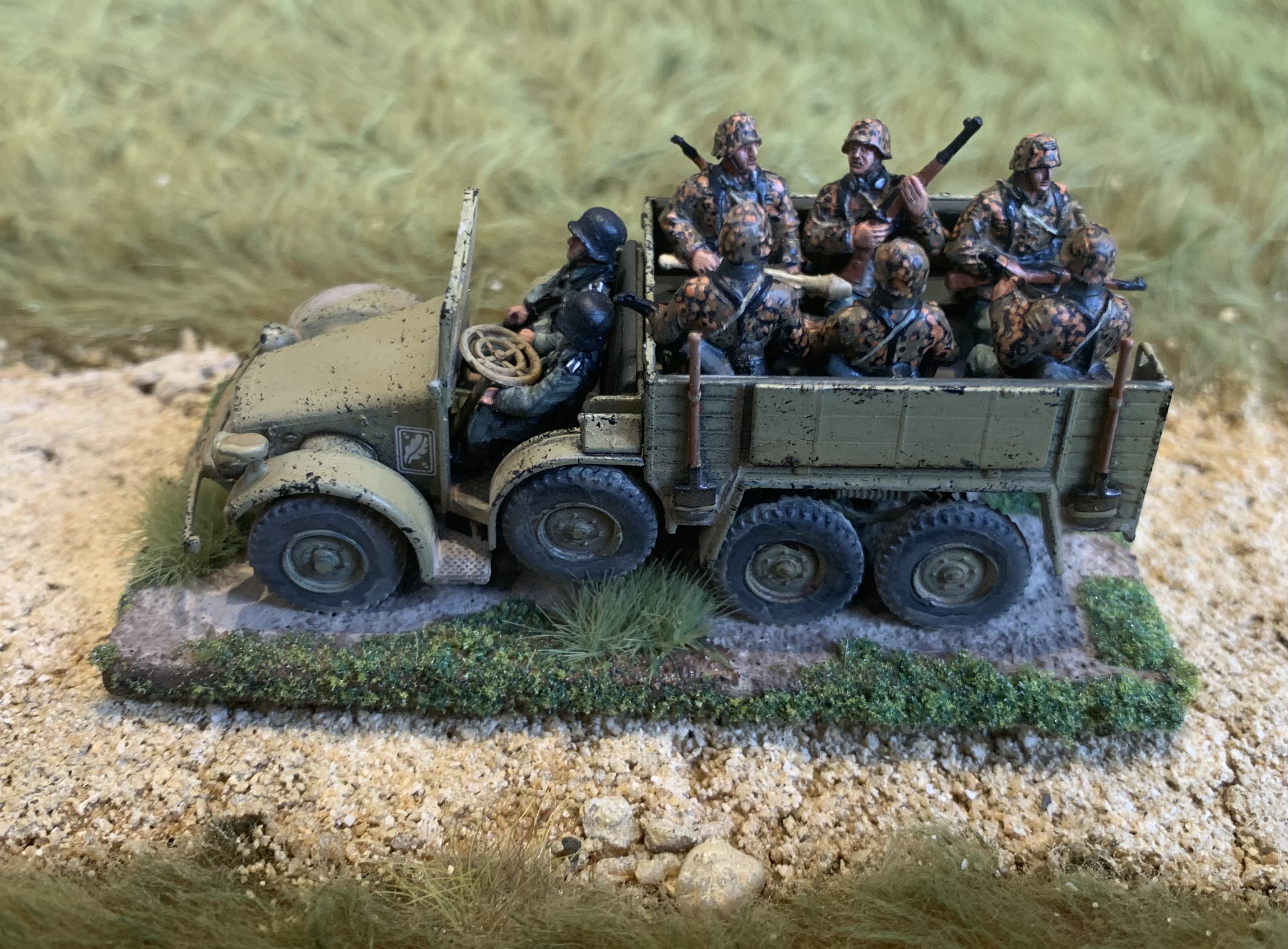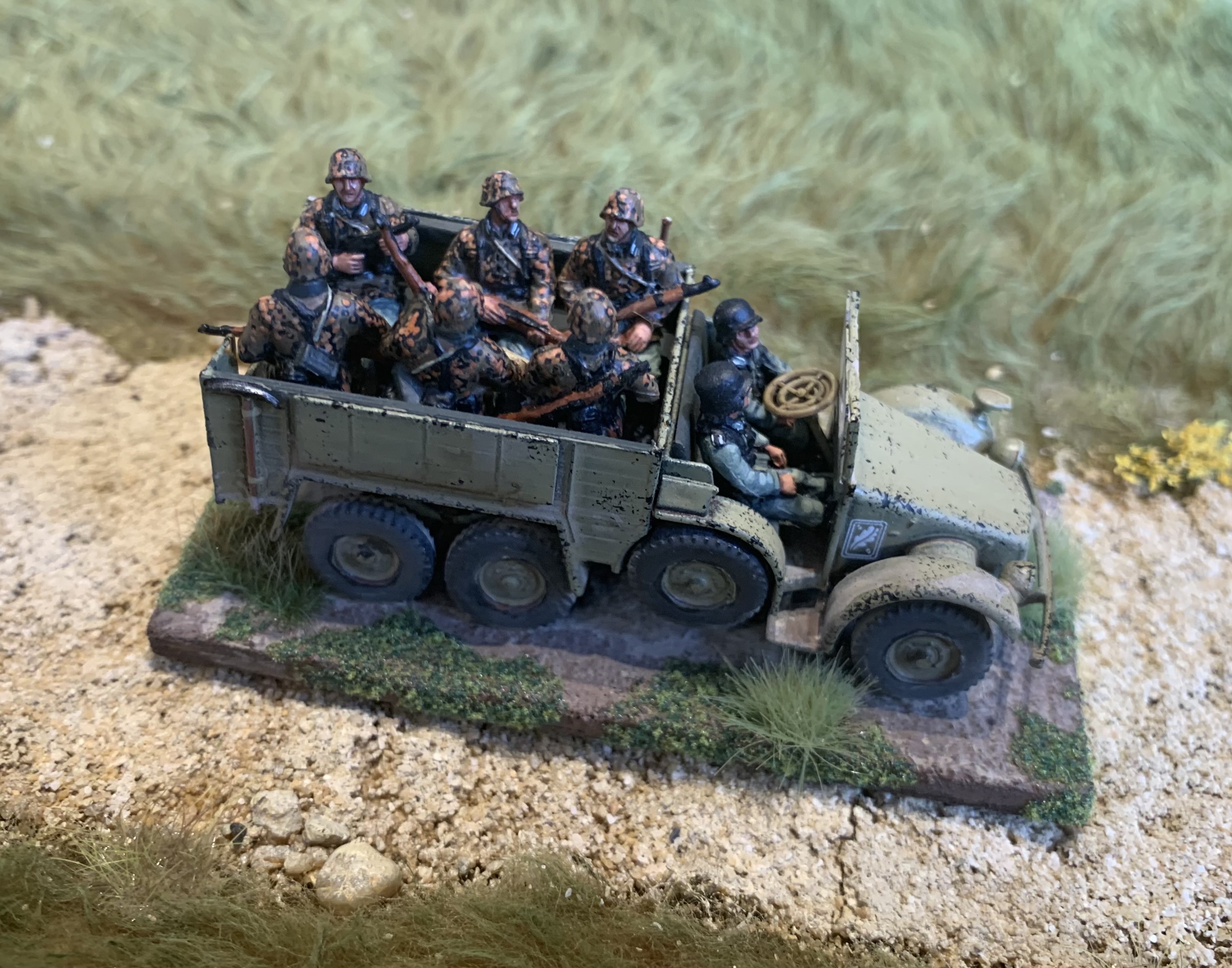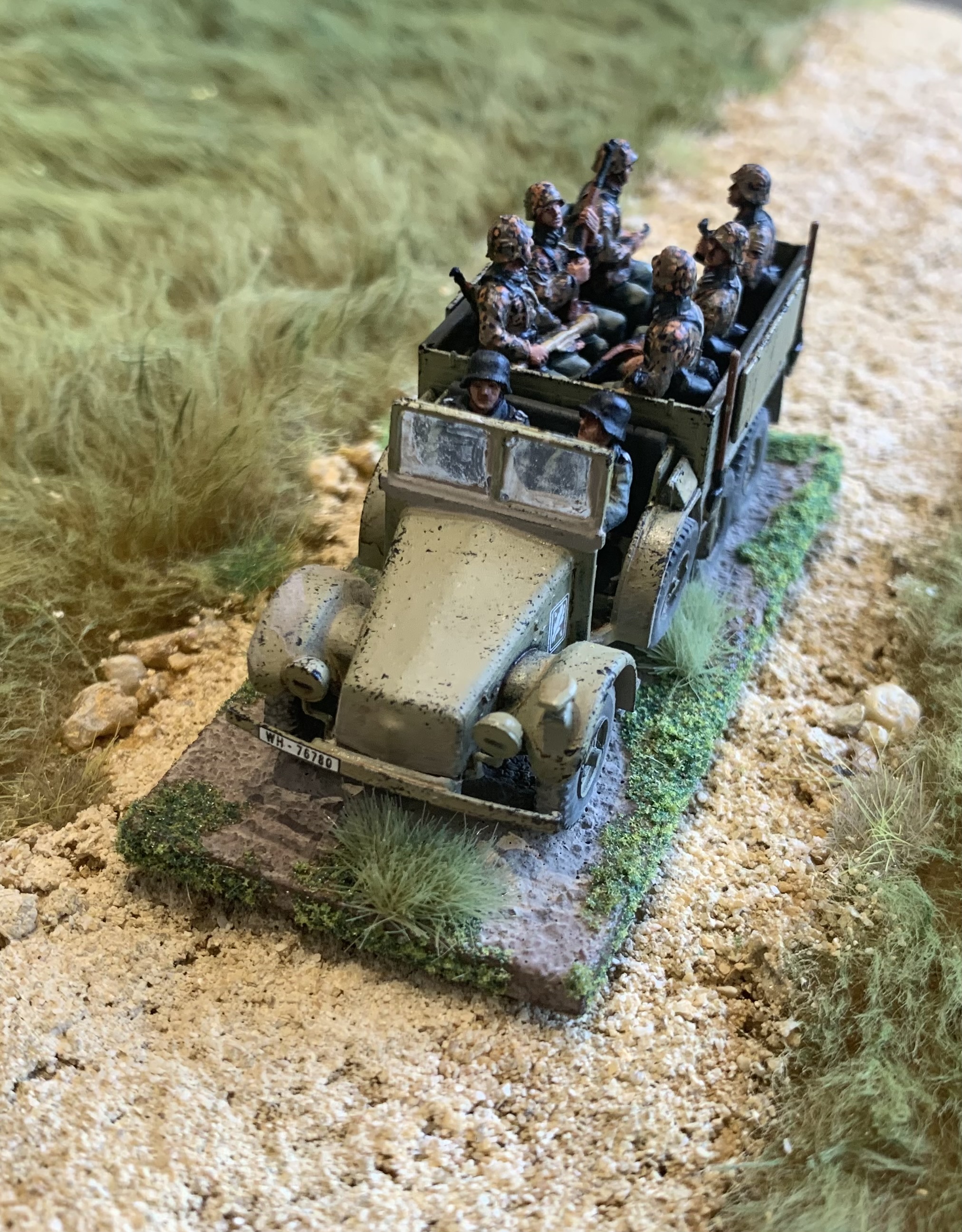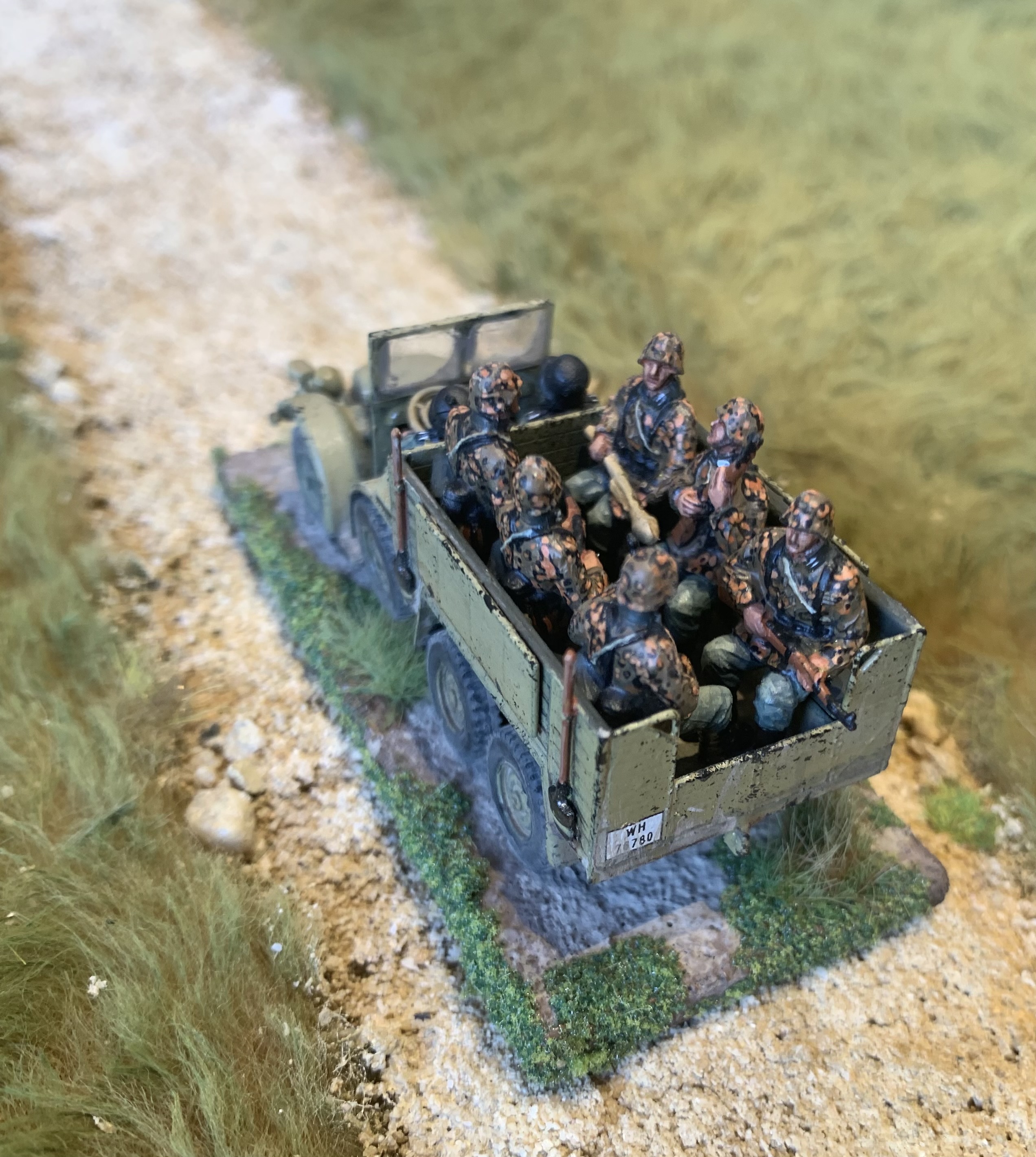 I had a trio of AB Figures British Army officers all based and primed and ready to hit the painting area. Finally while soaking up the excitement of Ashes cricket they were finished! Colonel Bairstow on the left, Captain Stokes in the middle and a casual General Crawley on the right. As always love painting AB figures, the detail is so good they make it easy. The poses are relaxed and natural, I especially like the folded newspaper or betting guide in the Colonel’s pocket. I used custom decals from Company B for their shoulder insignia as that is getting too small for my painting skills and eyes. My eyes are old and grey…… Usual British colours with three shades. Nice gold buttons too on the Colonel’s jacket. Behind is a Dodge weapons carrier from Italeri, a kit that is quite rare these days. Shame they don’t re-release it as I would buy a couple more.