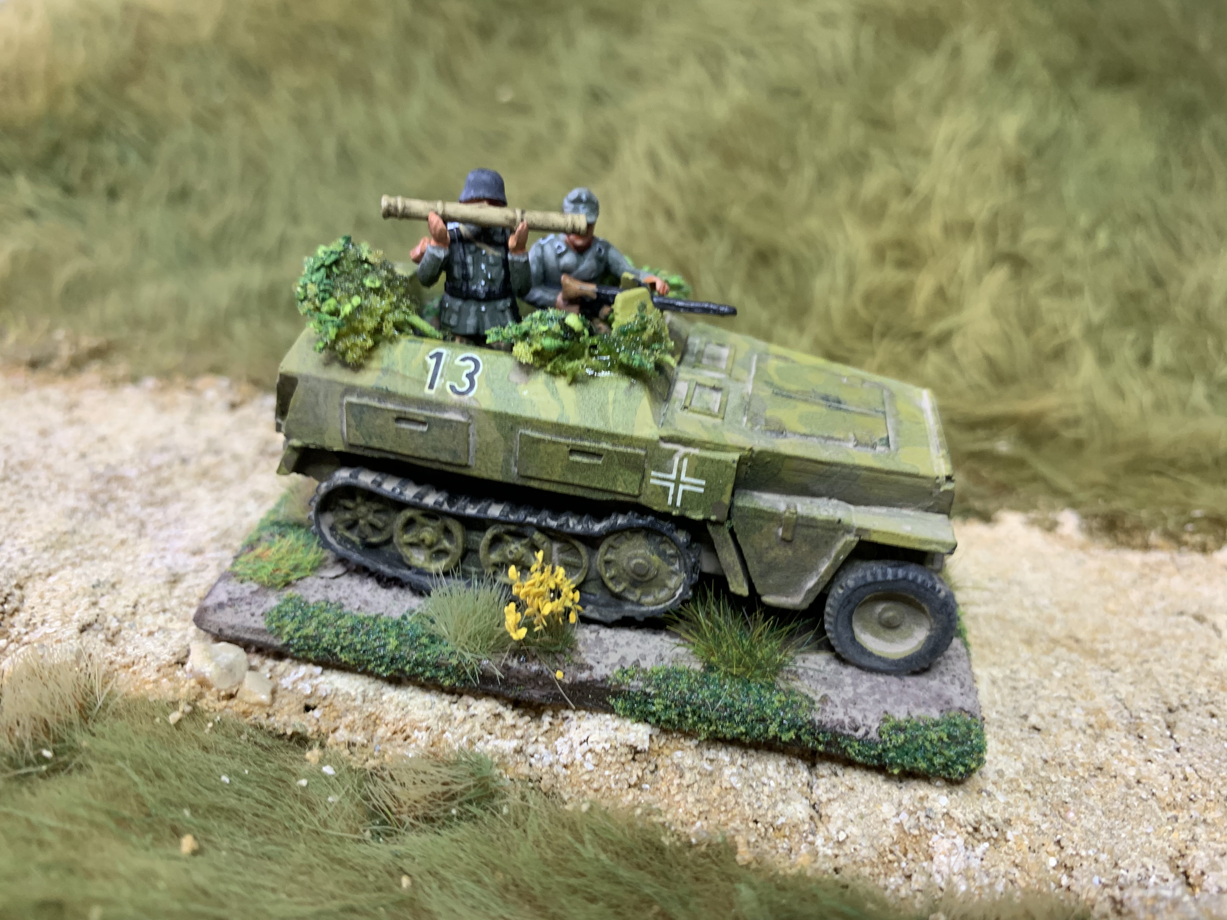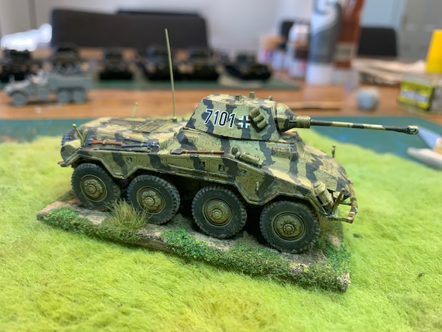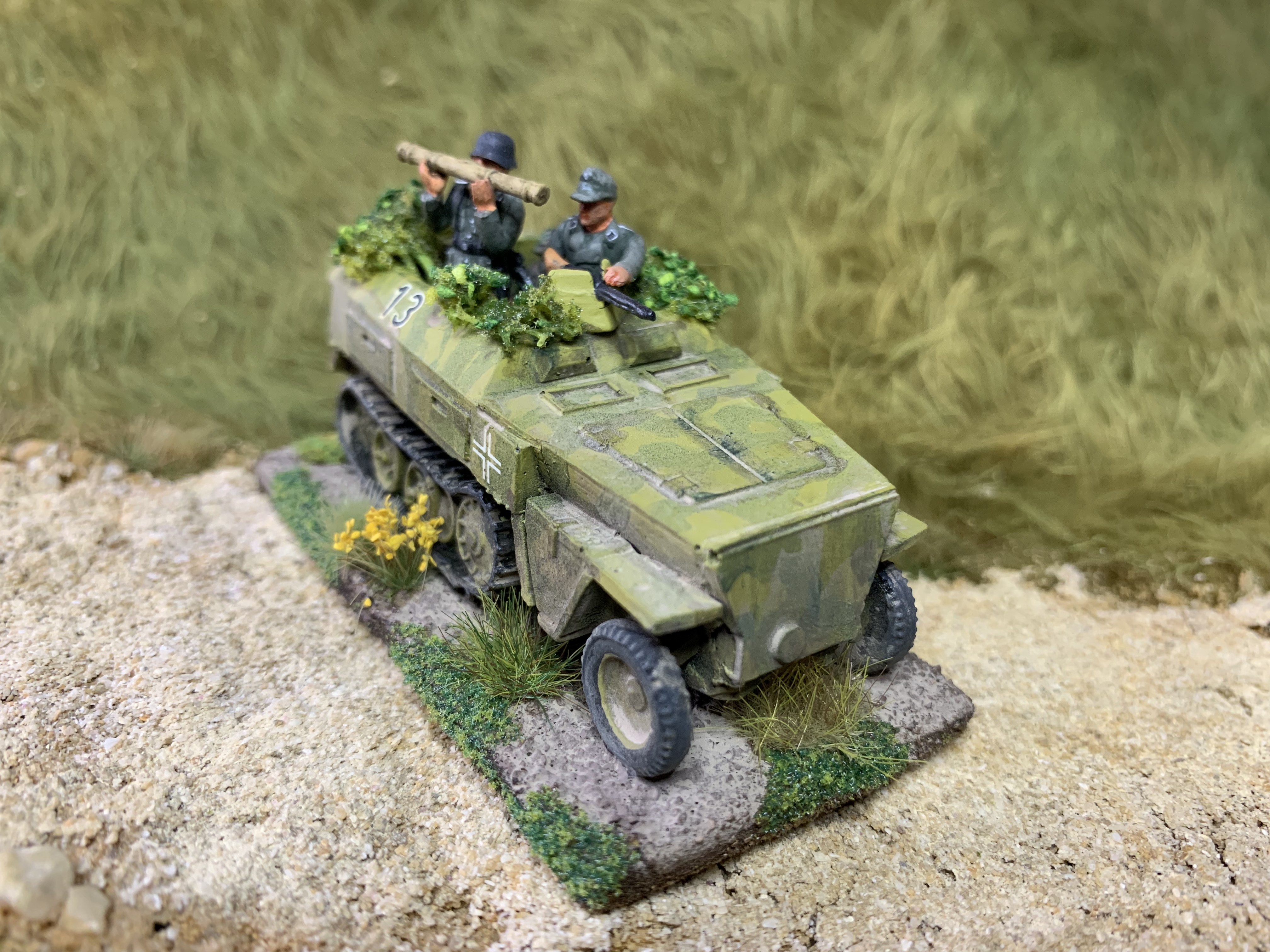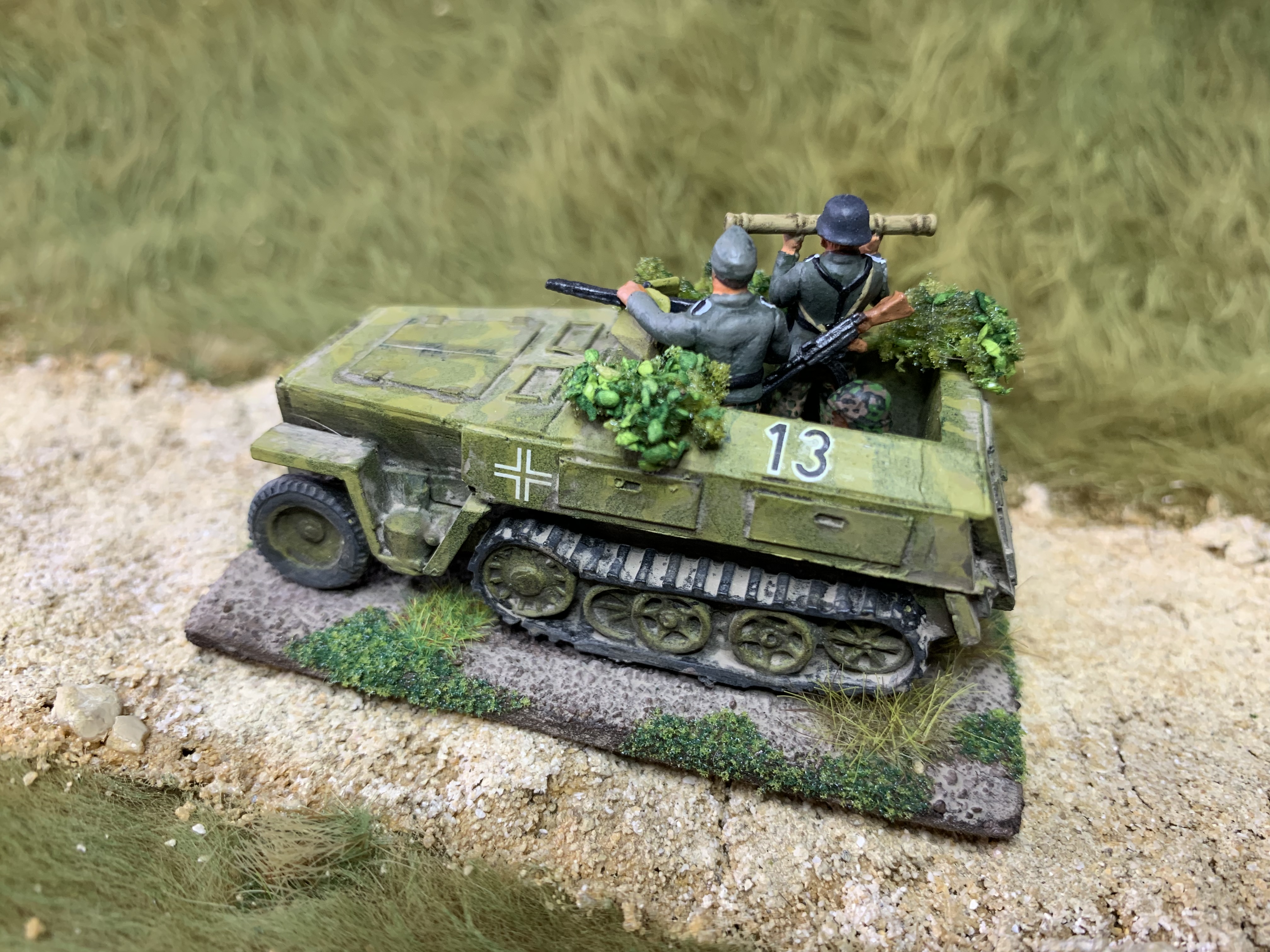 Happy New Year!! It has been a little slow getting things finished as overseas guests and Christmas holidays got in the way. But this little Citroen from ACE Models found its way onto my dining room table and was first off the queue for 2024! I thought I could use this as an emergency transport on the tabletop or just some extra cover on the streets of Normandy. It is a tiny little kit with tiny little parts. Luckily it was quite easy to put together and i did not lose any bits for the vacuum cleaner to pick up. I struggled with the body not fitting flush onto the chassis which leaves a bit of a gap around the boot area but nothing too serious. I painted the seats a nice red brown before putting the body on top. It was a struggle getting windows and the windshield in without making a big old mess. When the windshield needs to be slightly curved I need some kind of more flexible clear plastic. Then there is the problem of not getting glue on the plastic, but having enough glue to make sure the windows stay in place. Tricky business. I painted this a nice light grey and used some metallic silver to highlight the chromey bits on the car like the hub caps. The decals were nice and worked well, of course being extremely tiny they tested out my eyes and manual dexterity……